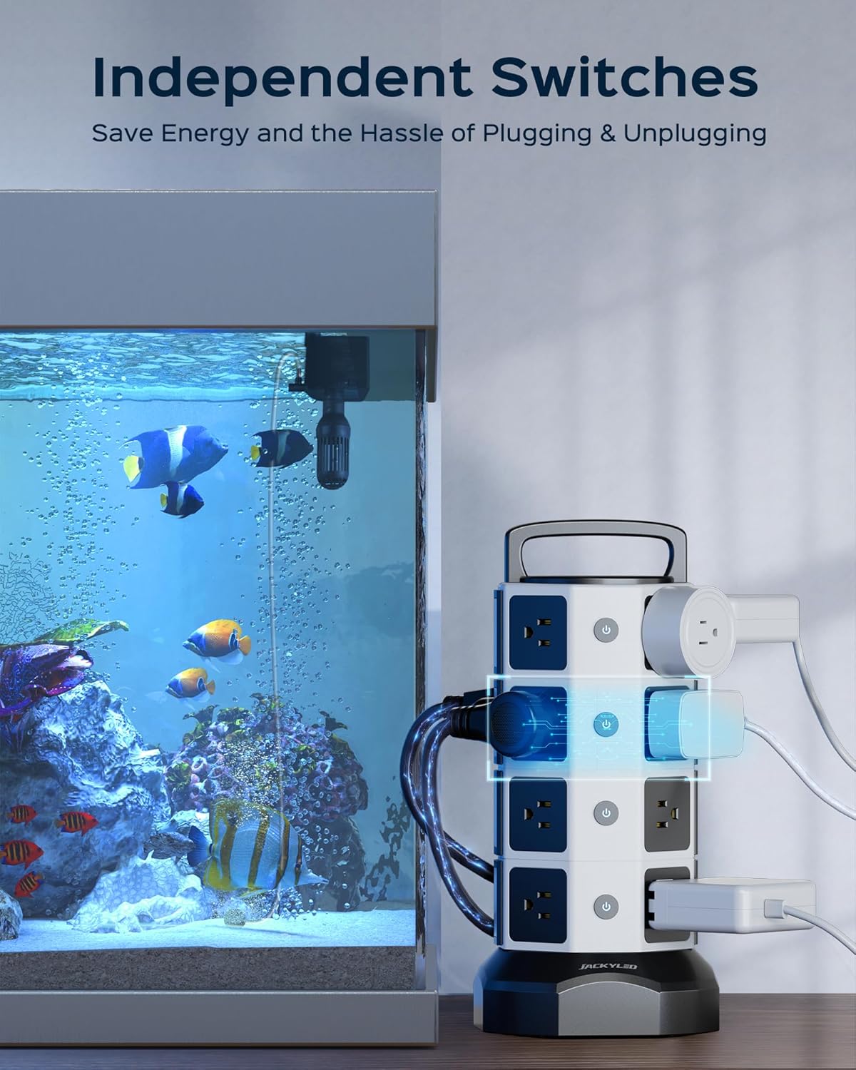 - ▶【Save Energy & Space】Each layer of the tower has an independent switch to help you save electricity when the other outlets are not in use. In addition, with the vertical tower design, JACKYLED charging station helps you to save space and you don’t need to worry about big plug blocking the other outlets.