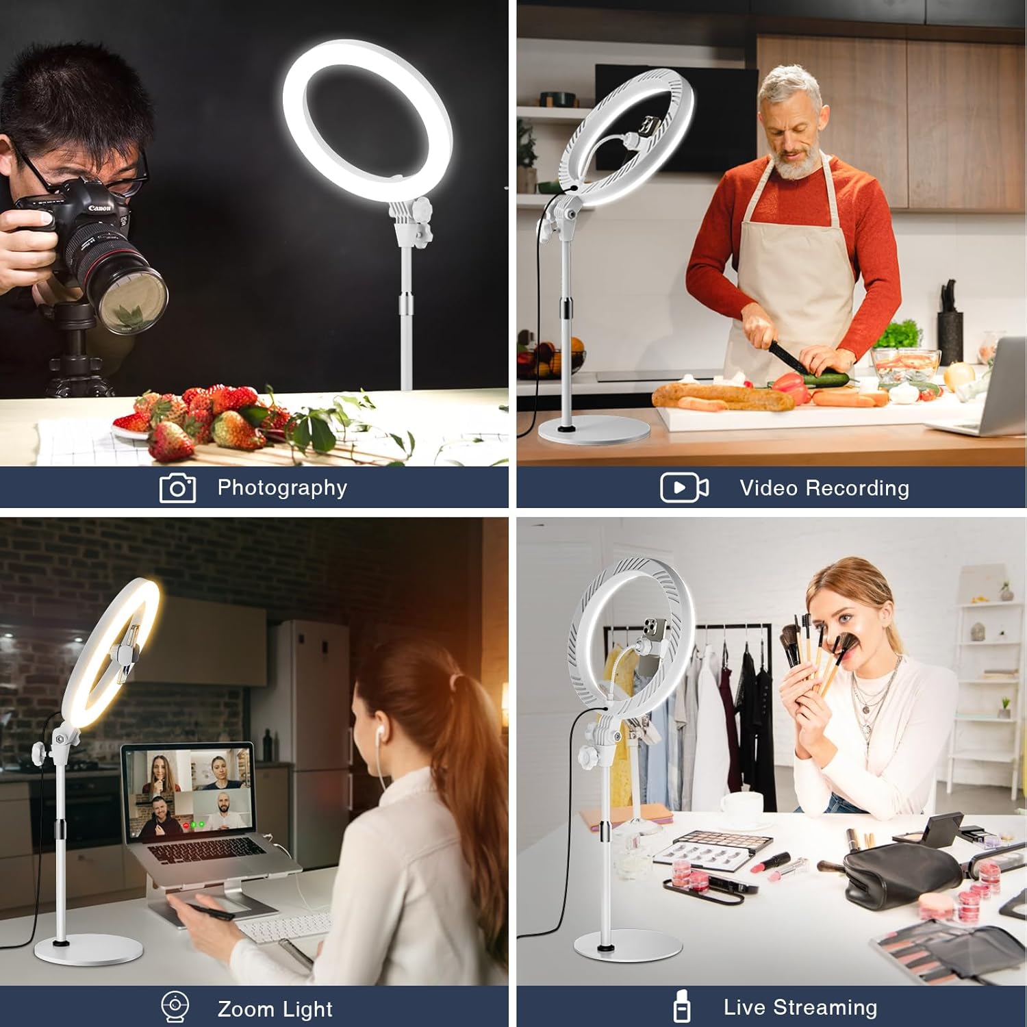- DIMMABLE LED LIGHT: Enhance your lighting game with our halo light! This desktop circle light offers 3 color temperature modes (cool, natural, warm light) and 10 brightness (3000K-6500K), perfect for video recording, live streaming, vlogging, makeup, podcasting, blogging, video calls, YouTube, TikTok, photography, and more. Whether you are at home or in the office, you can use this versatile bright and soft fill lamp to light up your life and radiate beauty