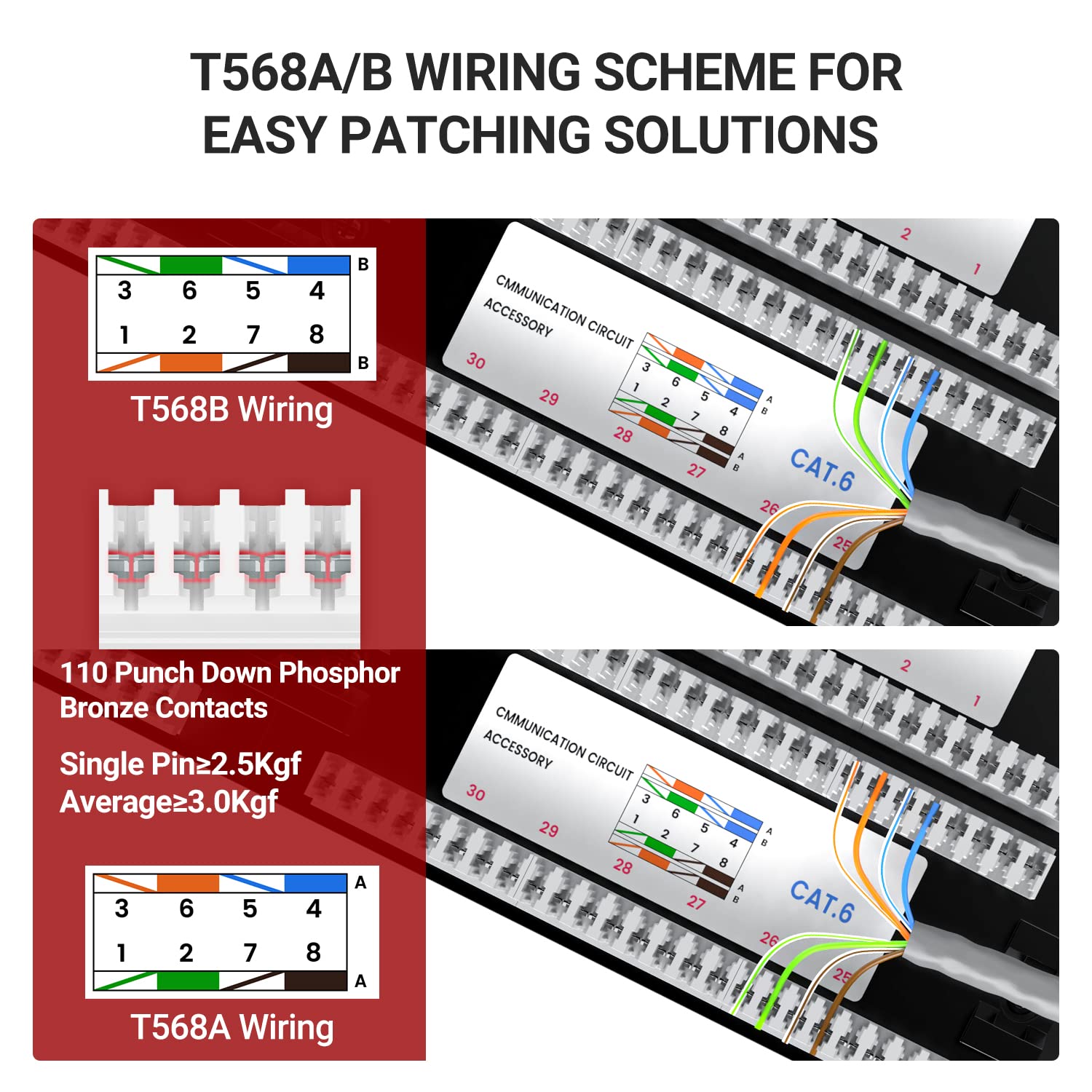 - T568 A&B Wiring color coding, written-on label and numbered ports on the back and front for easy Installation and identification