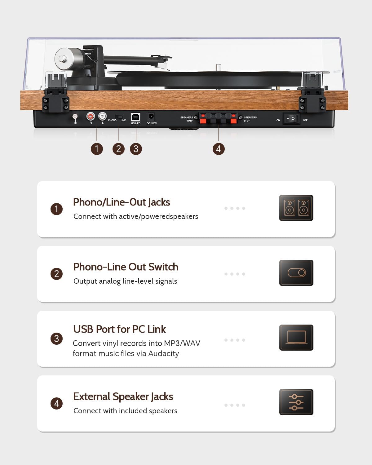 - [Great Connectivity Options] Built-in switchable phono line and pre-amplifier allow to connect with the set of included speakers or your own externally-powered speakers via the dual RCA output cables