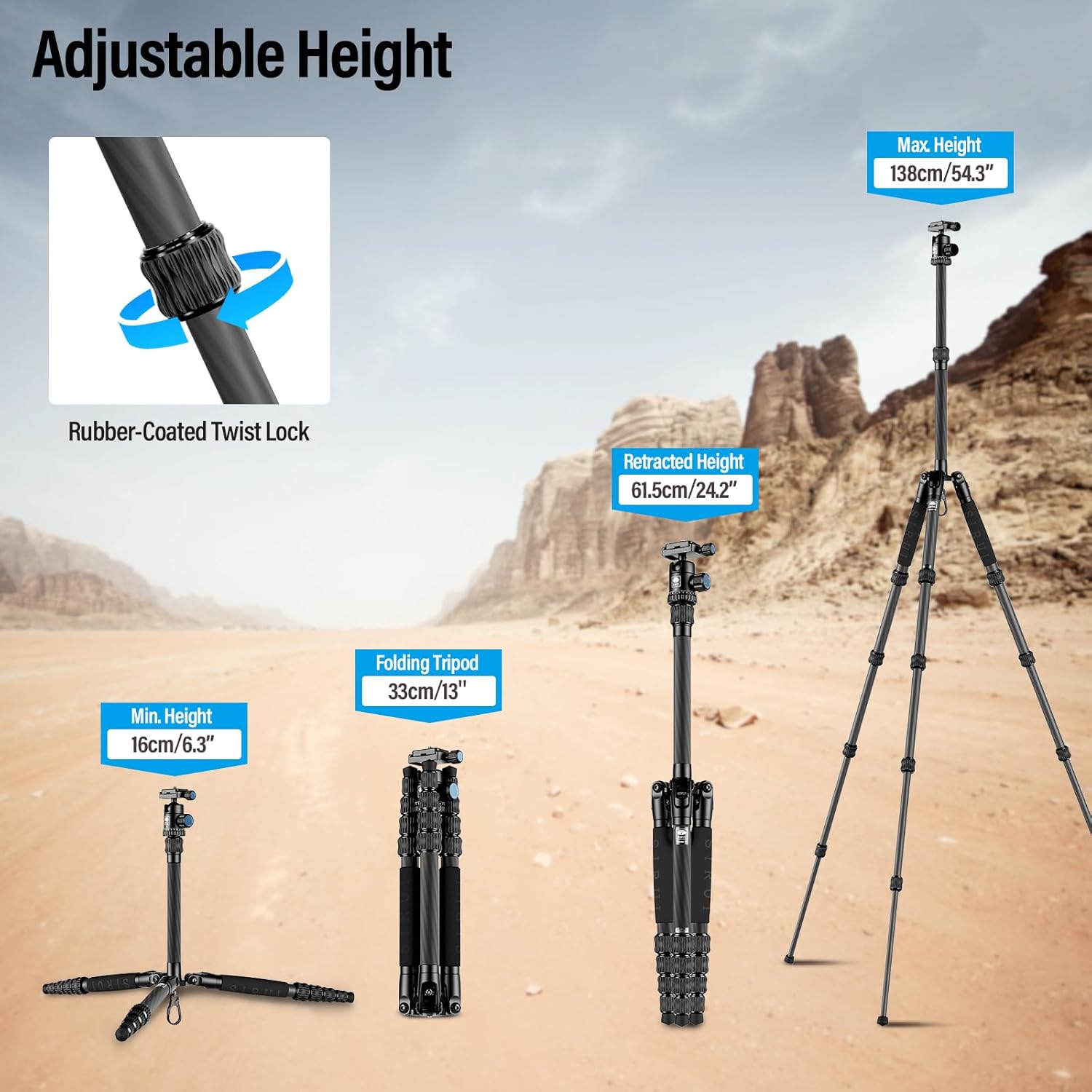 - Adjustable and Extendable: 5-section carbon fiber legs with quick release twist-locks allow you to adjust the working height from 6.3" to 54.3" in seconds, while with a folded height of 13". 3-position leg angle adjustment system can provide flexible shooting for different photography scenarios and conditions.