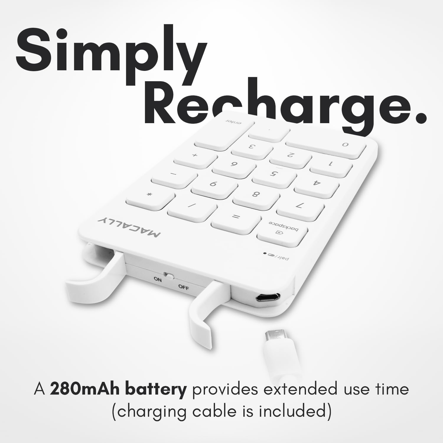 - SMART LONG LASTING BATTERY DESIGN: This Macally Bluetooth number pad features an Automatic sleep function feature alongside a rechargeable battery as well as an ON/OFF switch for extended usage.