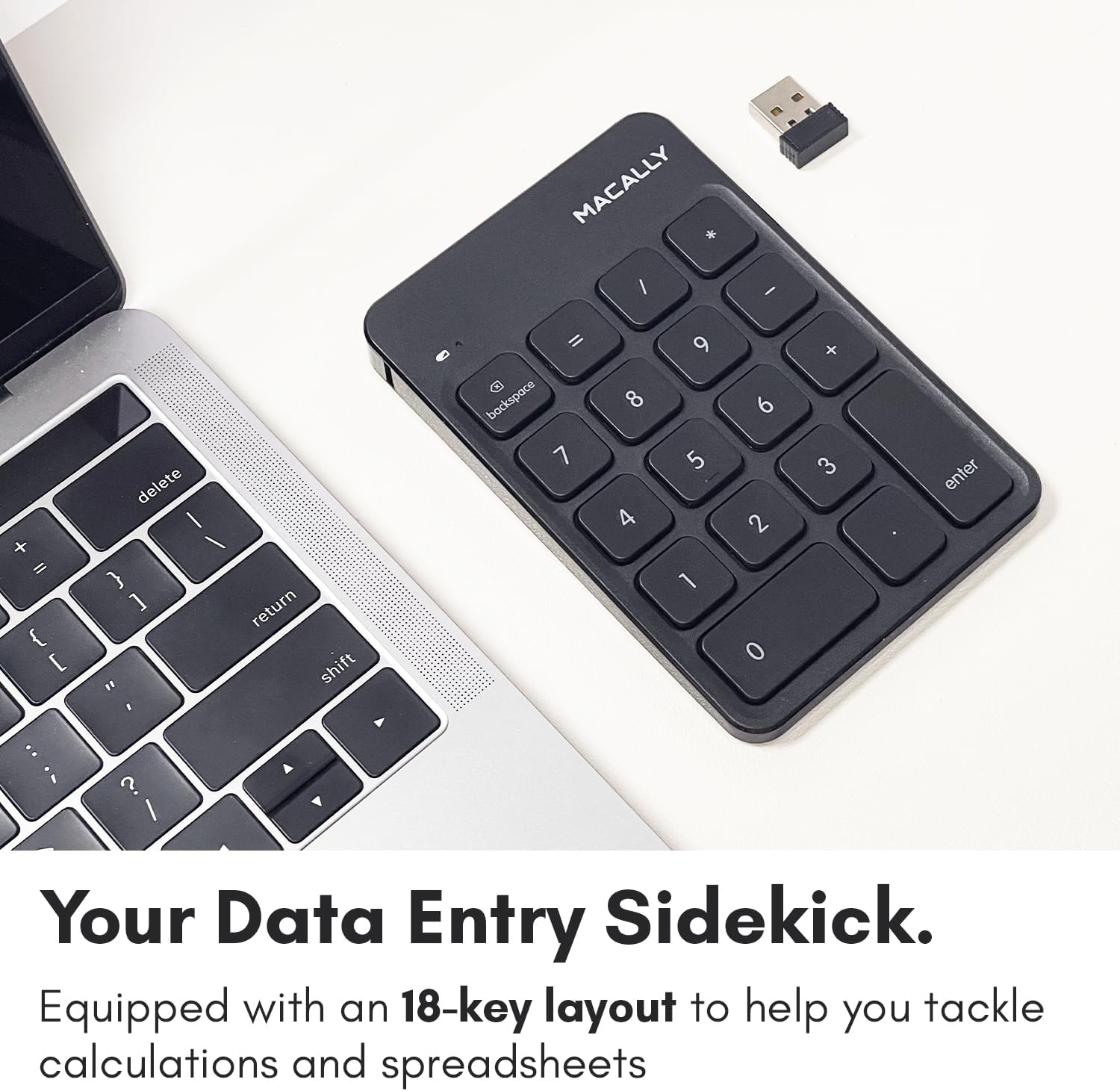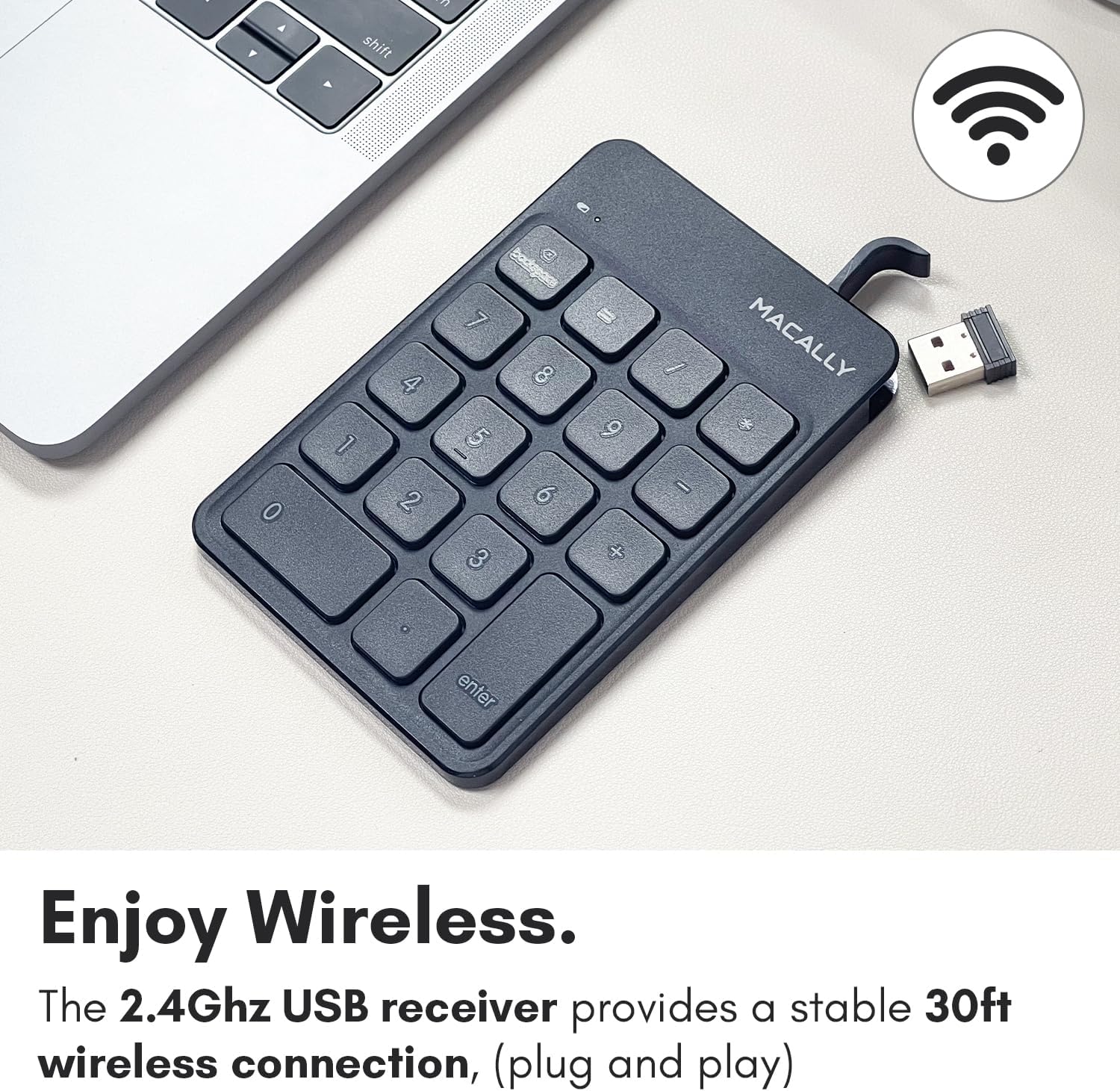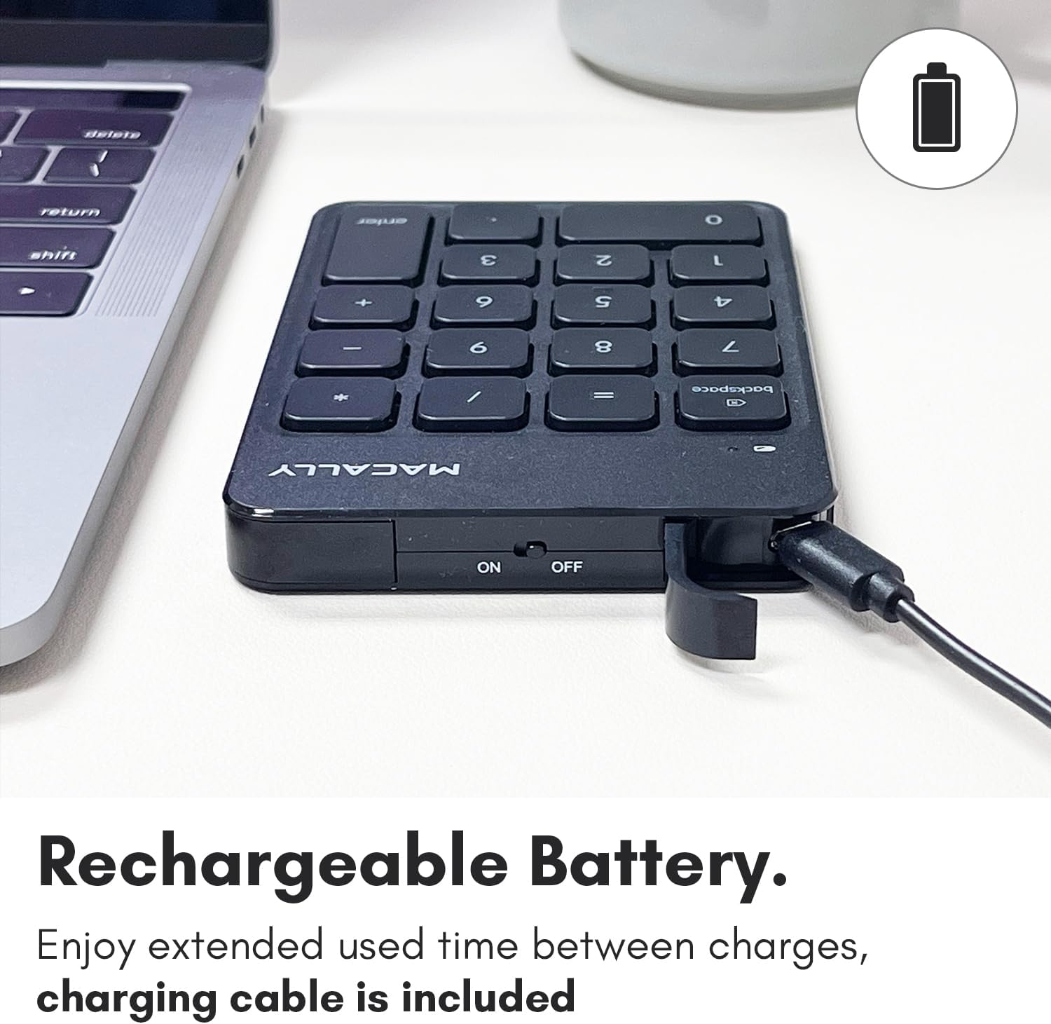 - RECHARGEABLE LONG LASTING SMART BATTERY DESIGN: This wireless Macally number pad features an automatic sleep function feature alongside an ON/OFF switch