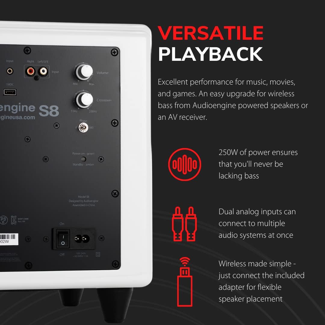 Audioengine S8 250W Wireless Powered Subwoofer, Built-in Amplifier (Wireless, White)