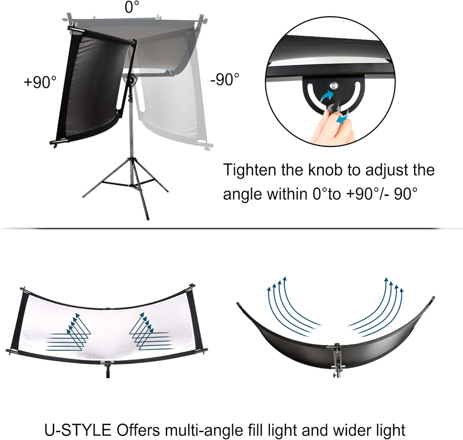 - ARC-STYLE DESIGN:The U-Shaped Reflector Able to Refract Parts of Light for Better Focusing on The Details You Need to Highlight.Angle Adjustable within Plus or Minus 90°,Offers Multi-Angle Fill Light and Wider Light. Be Adept in Capturing The Light in The Eyes