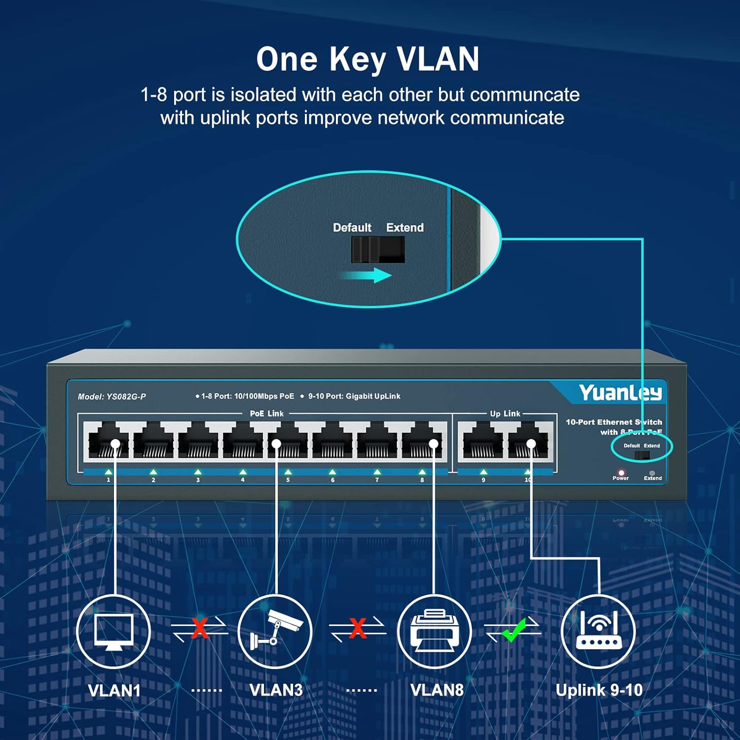 - 【250m and VLAN support】 When the extend mode is enabled, single POE port supports 250m transmission distances and 10Mbps speed. 1-8 ports support VLAN isolation, reduce network congestion, improve the network safety.