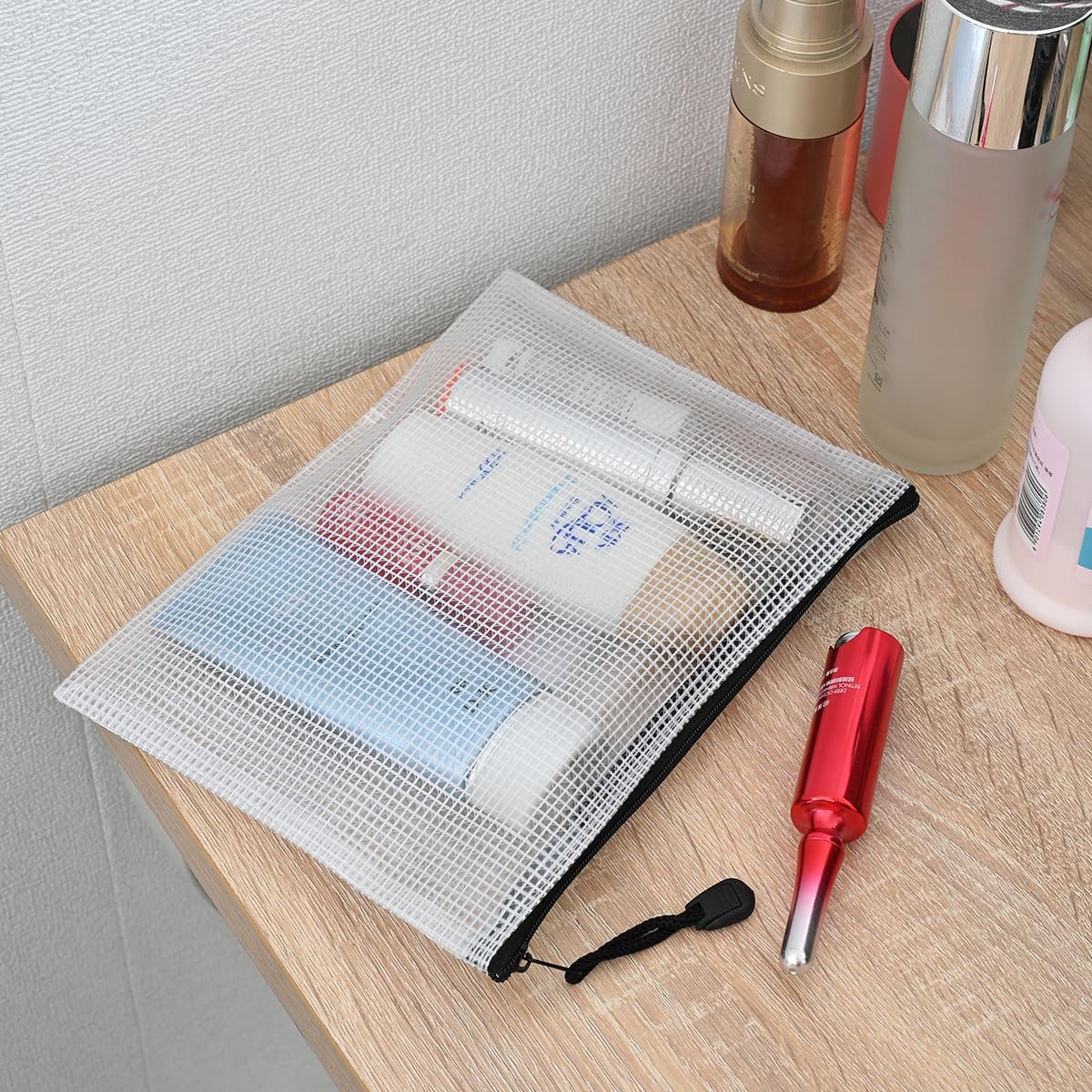 - Mesh pouches with translucent design. A solid PVC grid layout with moderate transparency could distinguish things in it easily, also protect your privacy at the same time