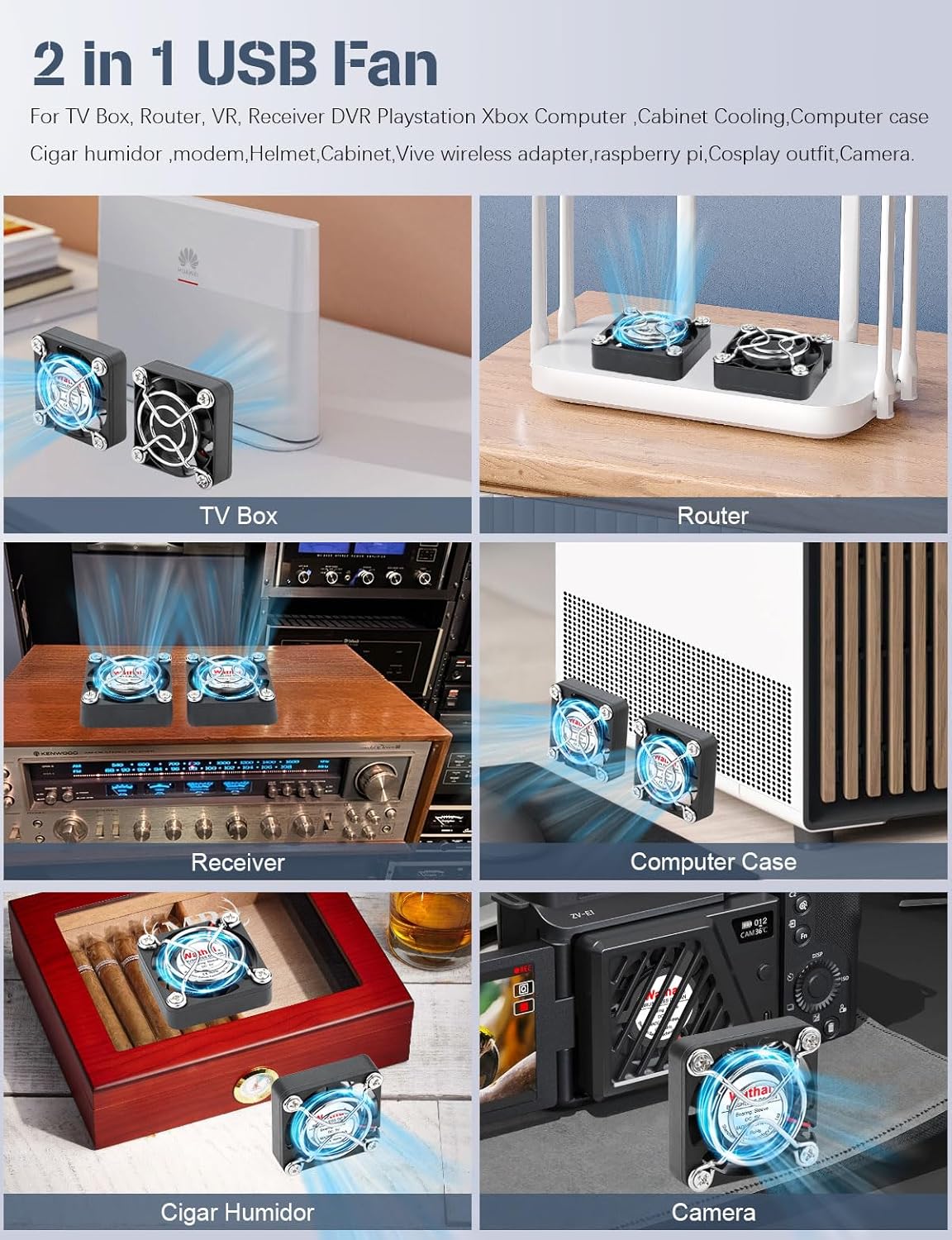 - Tiny fan: Suitable for ventilation of VR glasses, TV box, Raspberry pi, Router, Small PC Case, projector, hard hat and other small electronic equipment ventilation