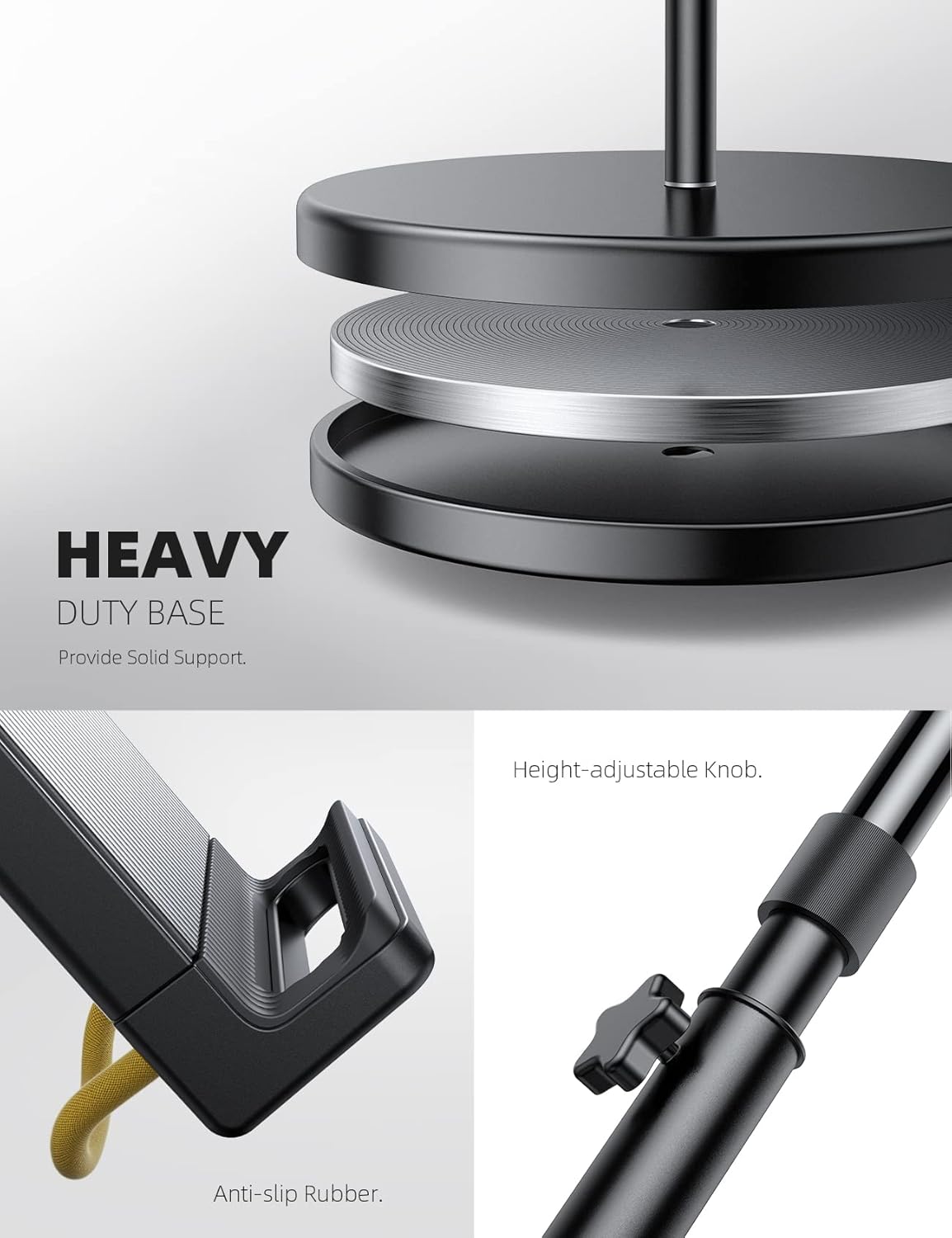 - 【Strong Stability】Heavy duty base makes the stand more stable and reliable. Made by premium solid aluminum alloy, the gooseneck arm and extension tube are more durable than usual. Lamicall tablet floor stand provides safe and secure support for your device.