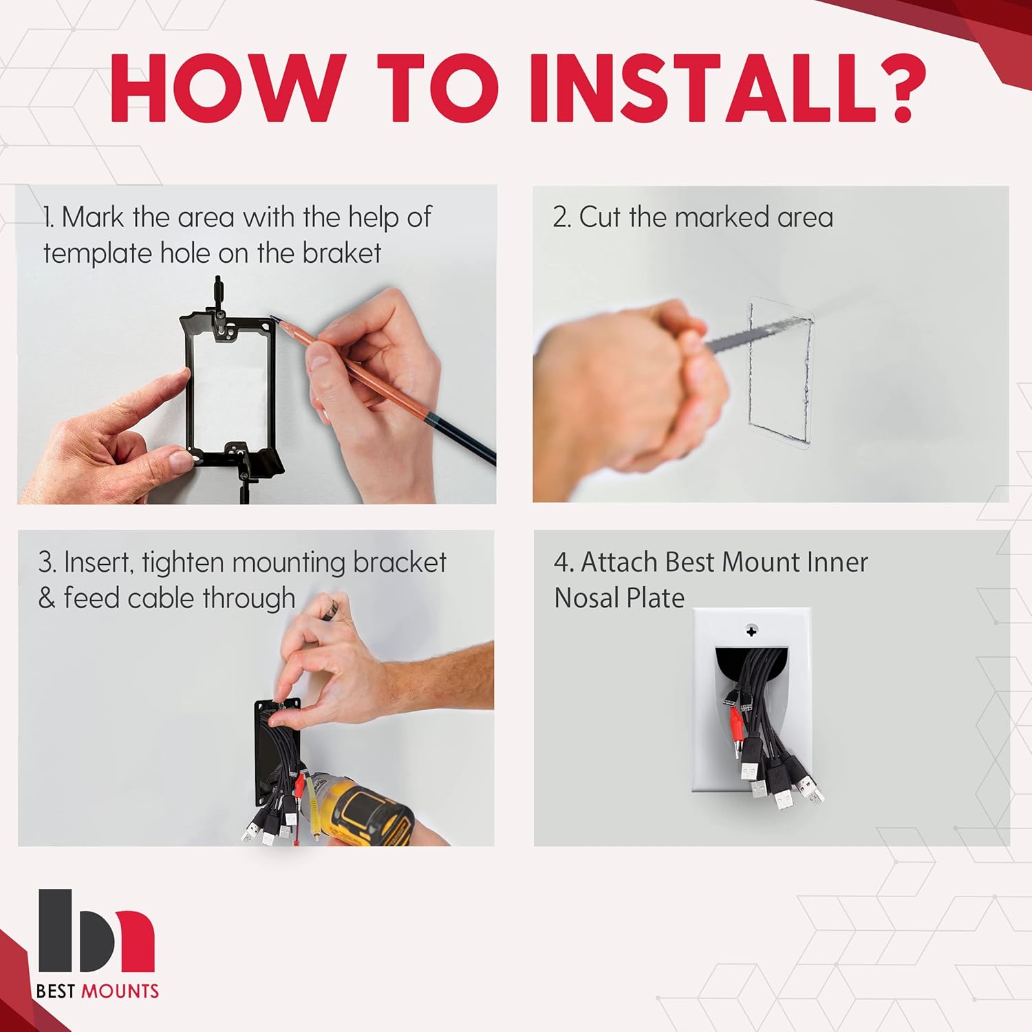 - No More Dangling Cables - Recessed low voltage wall cable pass through plates give your installation a finished appearance by hiding TV cords for wall mount TV but allow you the versatility of using the cable types of your choice, Just bring a drywall saw and screwdriver you're ready to hide those ugly dangling cables