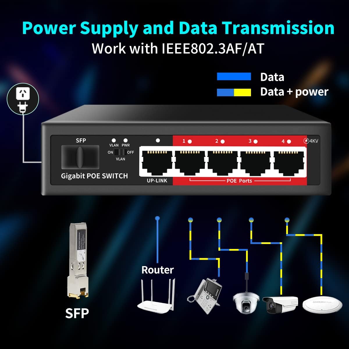 - 【4 gigabit poe switch@52W 】PoE switch with 4 1000M PoE port + 1 1000M Uplink port,1 x 1G SFP,4×PoE ports providing up to 30W per port, total PoE budget 52W.1 gigabit ethernet Uplink Port for connecting NVR and Internet , etc..