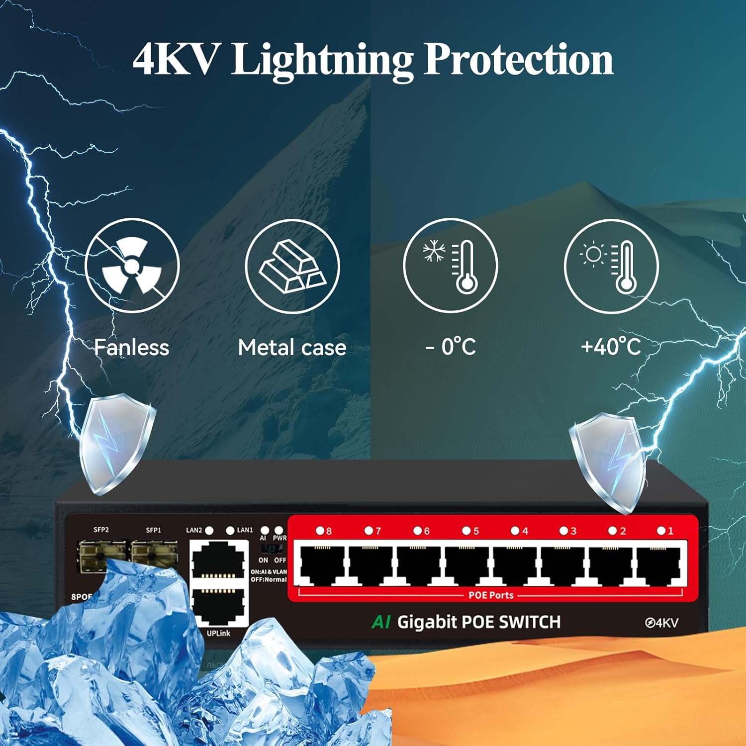- 【4KV Lightning Protection】STEAMEMO PoE switch have professional lightning protection design-up 4KV port and power supply thunder prevents, with two levels of protection design respectively, effectively restrain the power of lightning from cable, which equivalent to give the entire network monitoring system with a security fence.