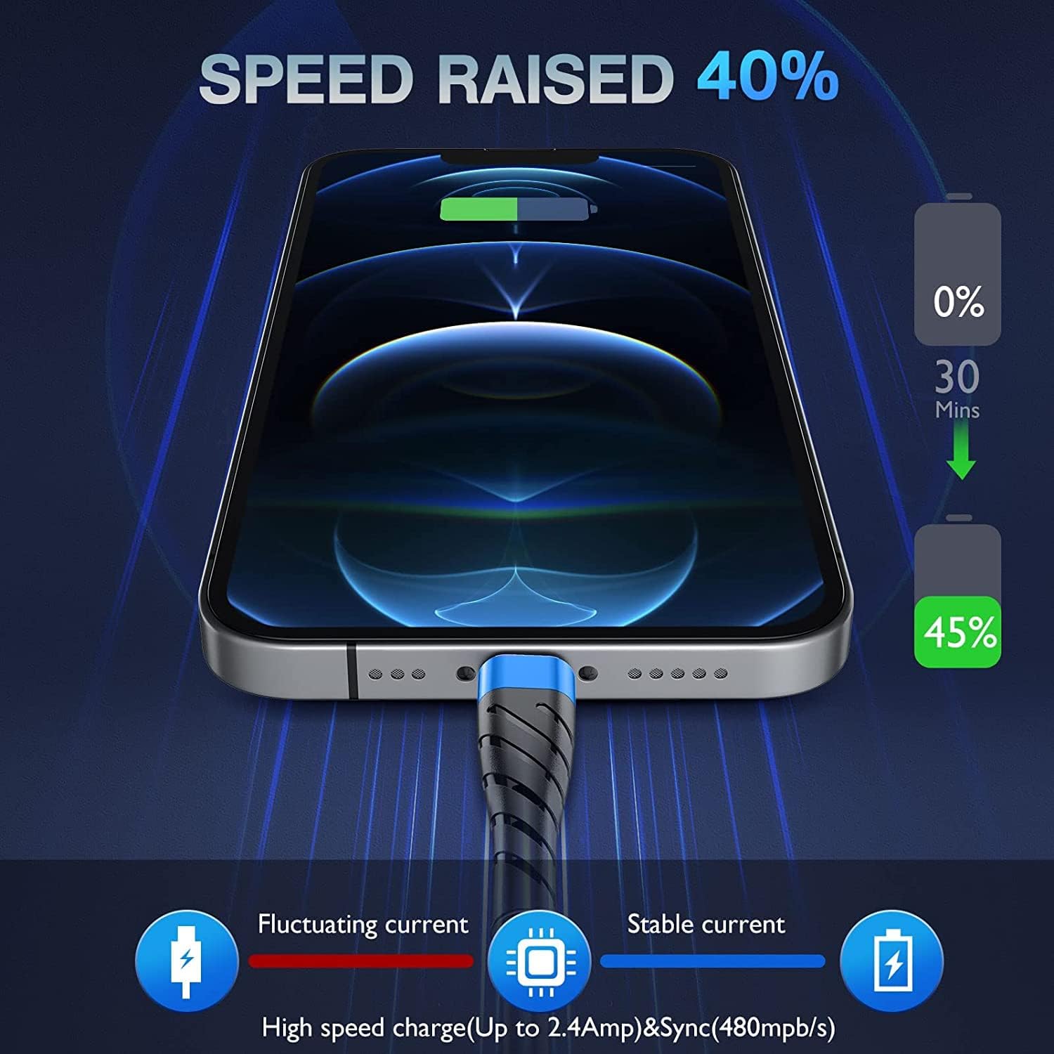 - [ Fast Charging & Data Sync 2 in 1 ] - 2.4 Amp(MAX) fast charging and 480mpbs/s data transmission, while preventing overheating and overcharging. Trickle charge and protect the device battery.