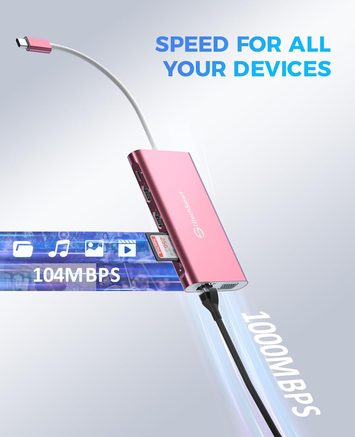 - 【Advanced Networking & Blazing-fast Data Transfers】 both power users and gamer will appreciate the plug and play instant access to the blazing fast 1000M Ethernet port. Download movies quicker, transfer files faster, reduce latency in games. The UtechSmart USB C hub is Ultra fast with speeds of 5Gbps for 2x USB 3. 0 Ports, one SD and ONE TF card slot, extra 2x USB 2. 0 Ports for your keyboard, mouse, or charging devices. Ensure the Wi-Fi connection more stable.