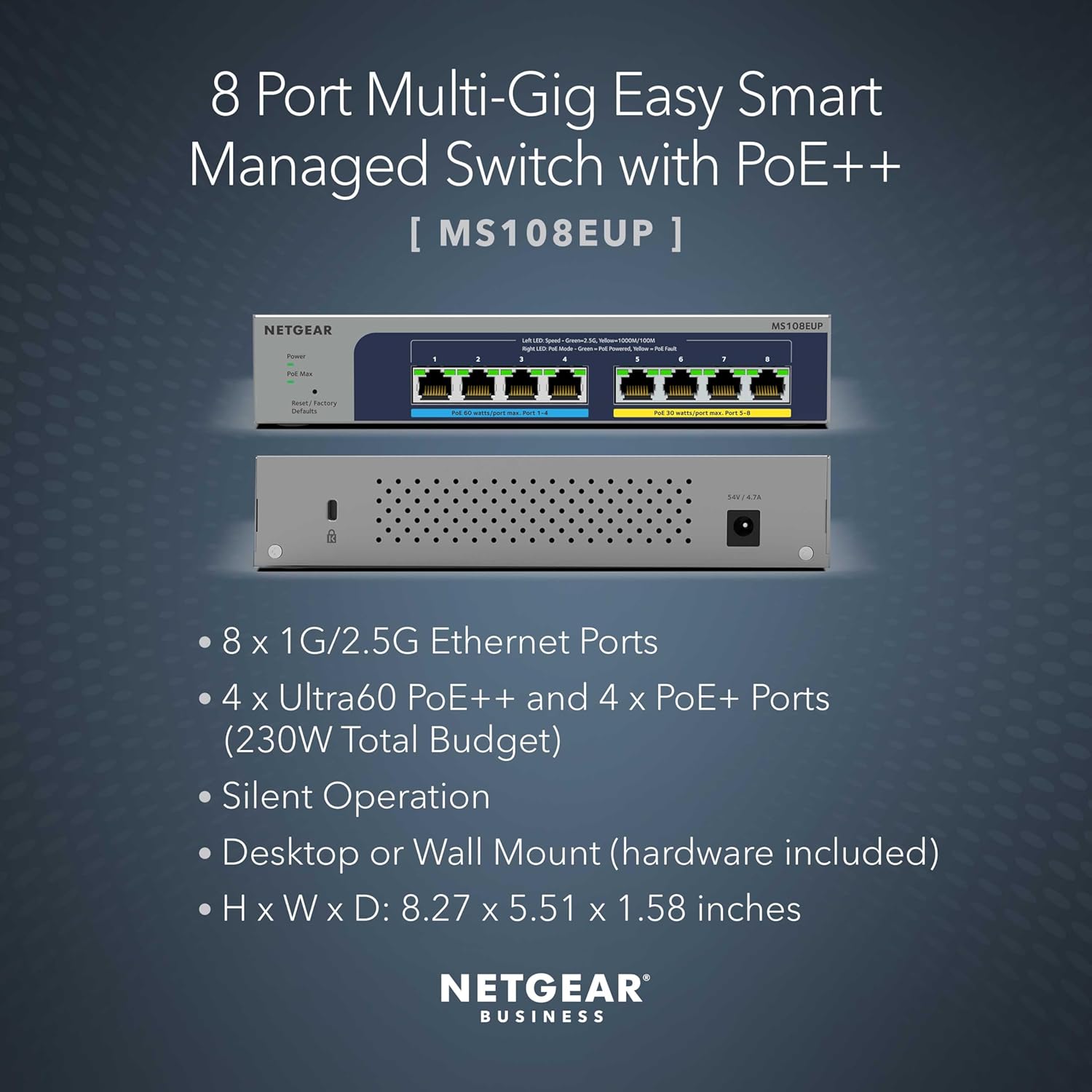 NETGEAR 8-Port Ultra60 PoE Multi-Gigabit Ethernet Easy Smart Managed Switch (MS108EUP) - Managed, with 4 x PoE++ and 4 x PoE+ @ 230W, Desktop or Wall Mount, and Limited Lifetime Protection