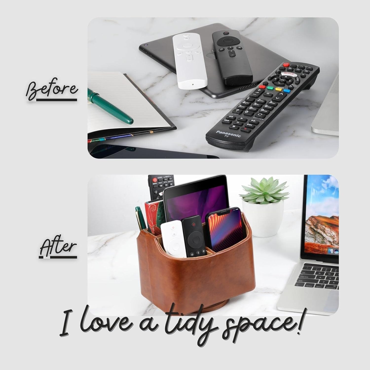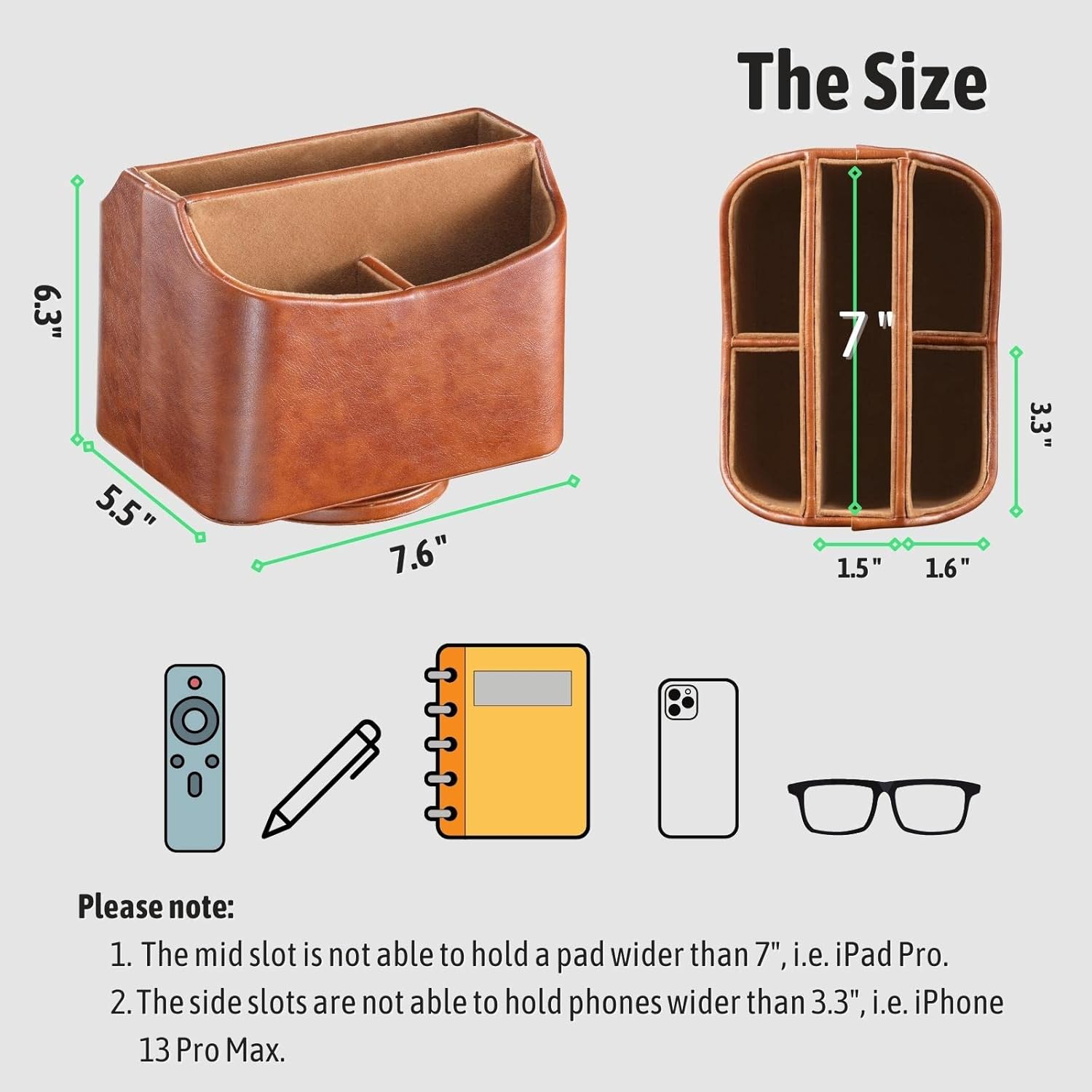 - Elegant & Practical: The remote control organizer features 4 small lots for media remotes, pens, eyeglasses, makeup brushes, and anything that fits, and a tablet pocket in the middle to store your desk supplies conveniently while keeping them easily accessible.