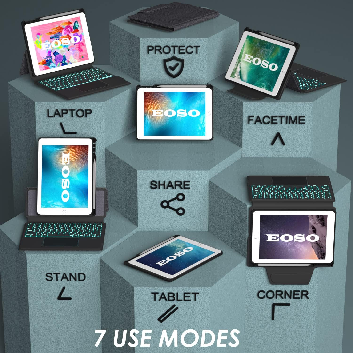 - ILLUMINATED TYPING:iPad keyboard 9.7 inch has seven different backlights colors and three modes backlight: single color - breathing-turn off backlight, ensures you don't have trouble while typing in low light.