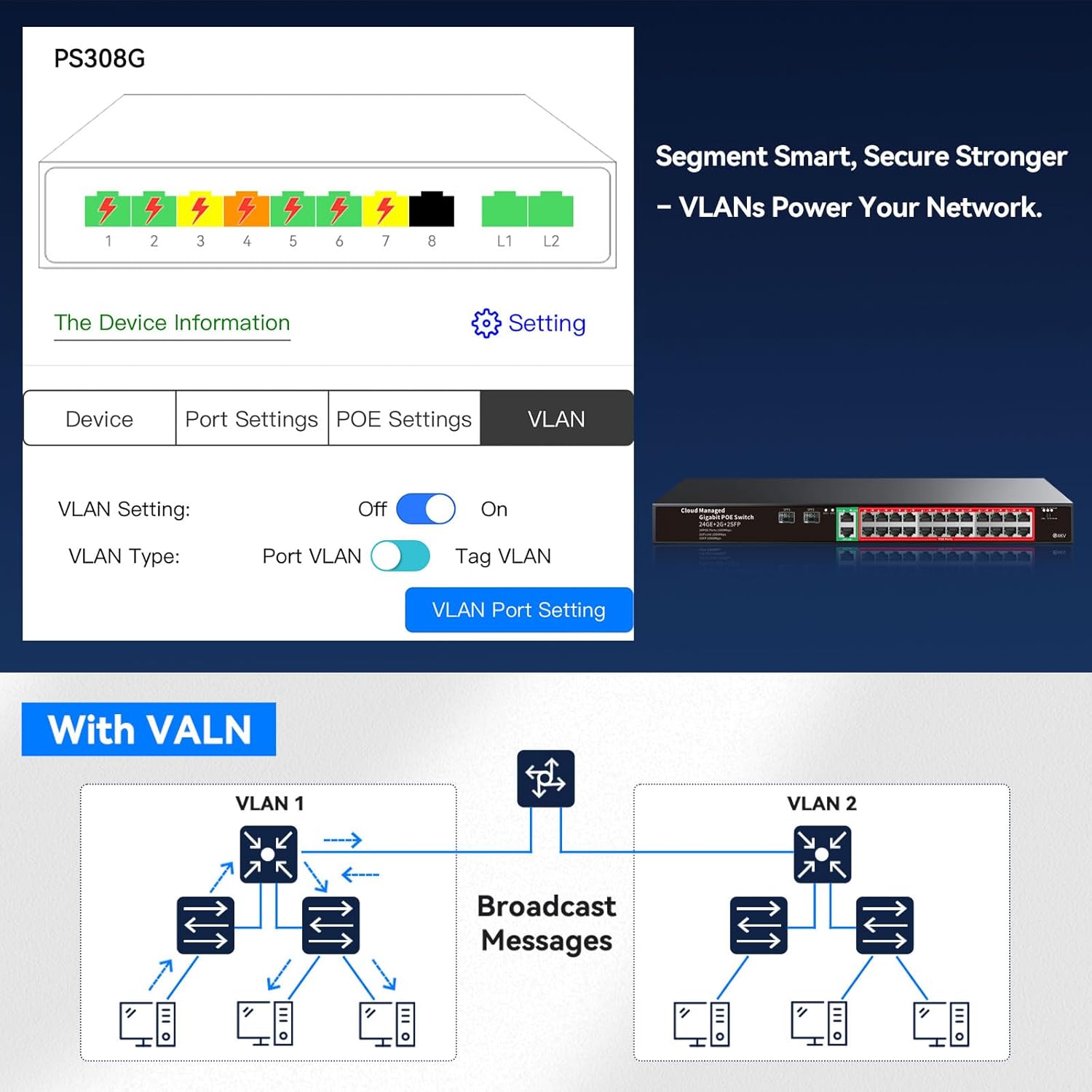 - Robust Protection for Your Network: Our 24 ports easy smart managed gigabit PoE+ switch comes with 4KV lightning protection. The dual-level design for ports and power supply blocks lightning strikes from cables, safeguarding your entire network system like a fortress. Plus, the short-circuit protection cuts off lower-priority ports if the total power hits 360W, preventing overloads, ensuring the stability and safety of your network.