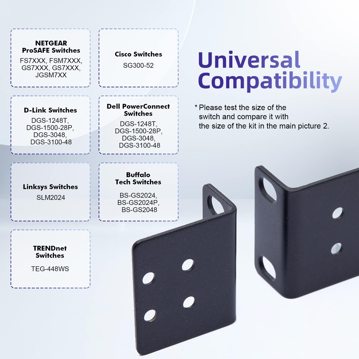 - 【Support Many Switch Models】The rack mount ears support 17.3" wide switches only! Please check the compatibility model list blow before purchasing to ensure this rack mount kit is compatible with your switch. It compatible for most of Buffalo Tech, Cisco, Dell, D-Link, Linksys, NETGEAR, and TRENDnet Products.
