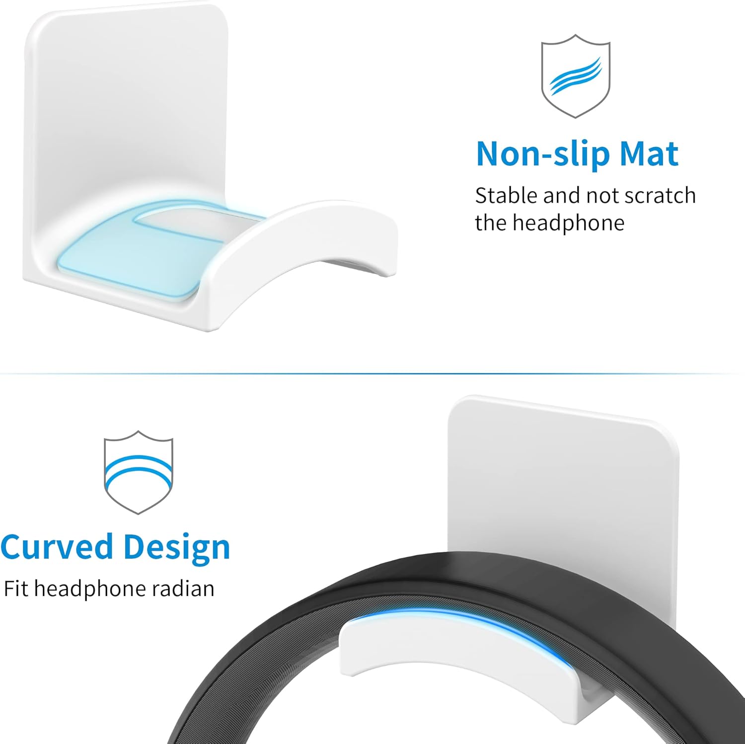 - Curved Cradle & Soft Rubber: The Headphones Holder designed with curved surface, perfect fit brand headset bands. In addition, the curved part is added rubber-ish material, not only does it keep the earphone band safe from scratching, but it also prevent the headset from dropping