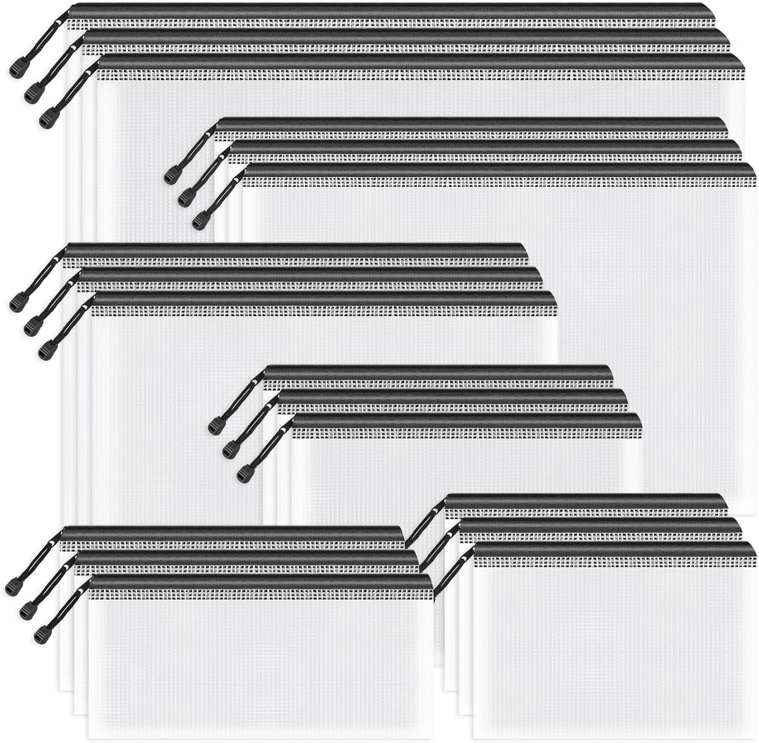 Umriox Zipper Mesh Document Pouch, 6 Assorted Size (Black, 18 Packs), Clear Zipper Pouches, Waterproof Travel Pouch for Office Supplies, Puzzles, Board Games and Craft Projects