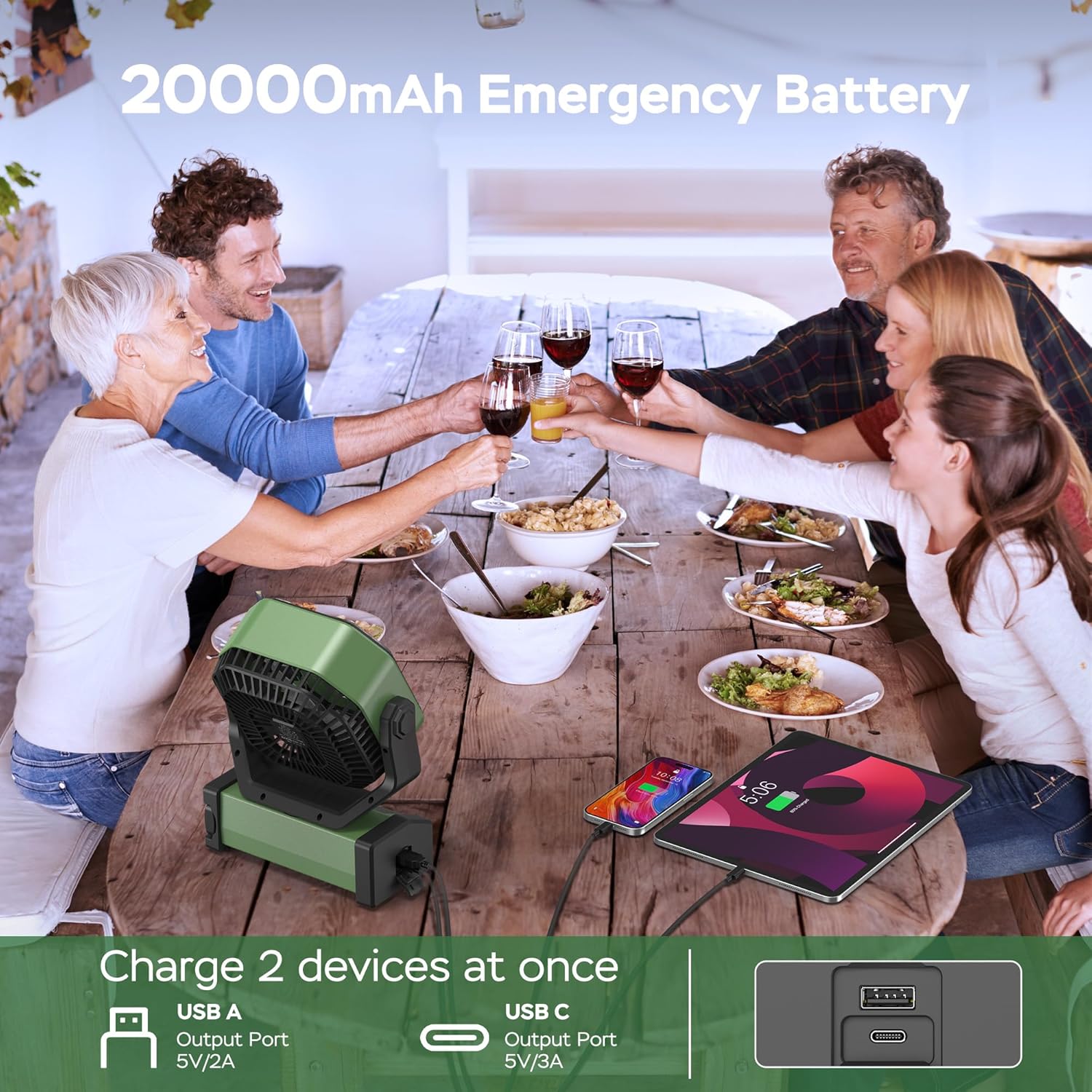 - Long-lasting Battery: The camping fan features a 20000mAh built-in battery with up to 60 hours of runtime on the lowest wind speed. Equipped with USB output ports for charging phones or other devices during power outages or outdoor adventures