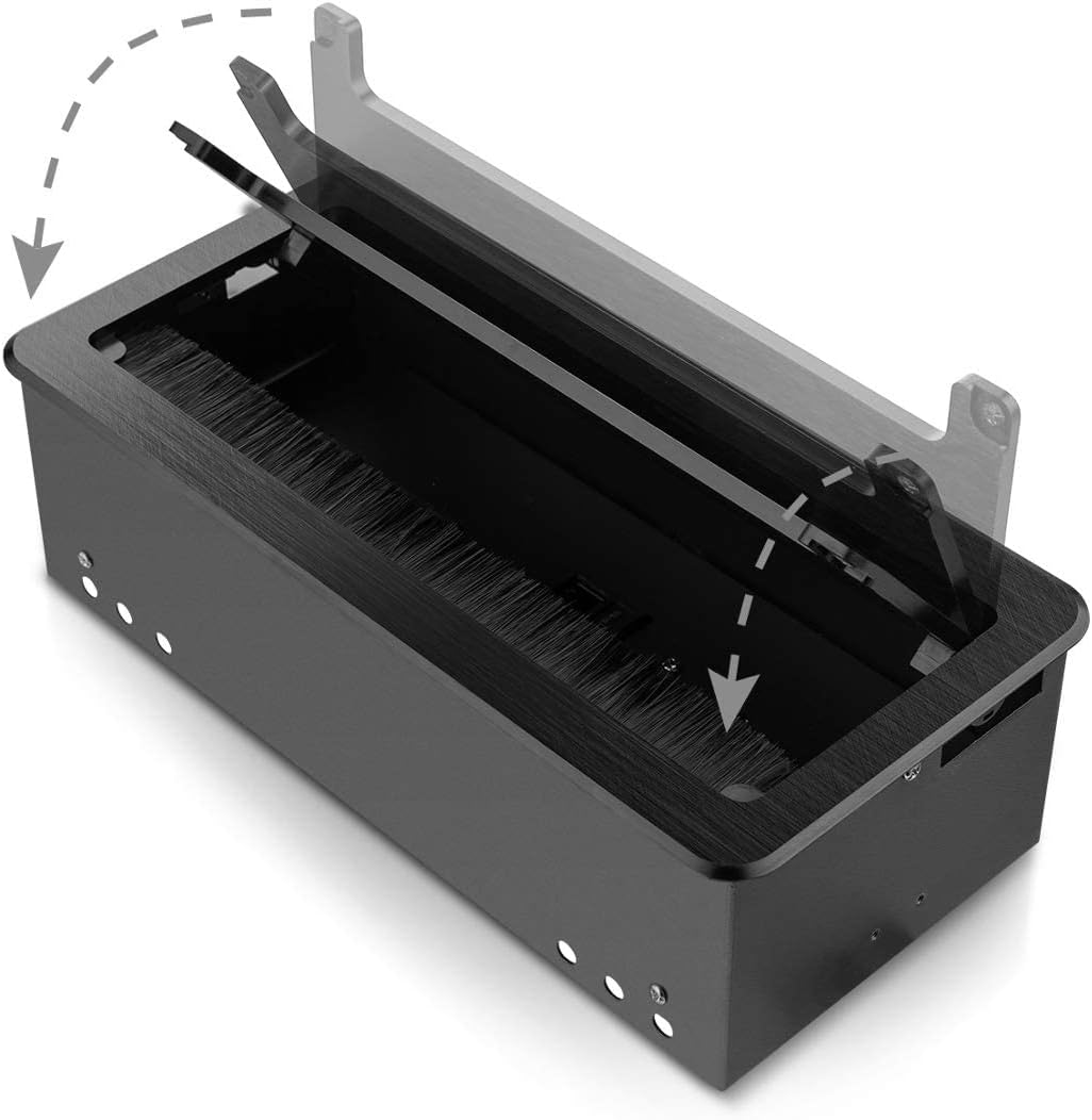 - 【Easy to Install and Use】Cut a rectangle hole on table, place the outlet into the hole, then screw it tight. Panel size of multimedia power box: 10.47" x 5.12"(266 x 130 mm), suggested hole cut size: 10.16" x 4.73" (258 x 120 mm), R(edge treatment)=0.49"(12.5 mm). Open the lid then gain access to the hubs and connections easily with its 45 degree panel. Close the lid with the cables still plugged in through brush and opening in the lid.