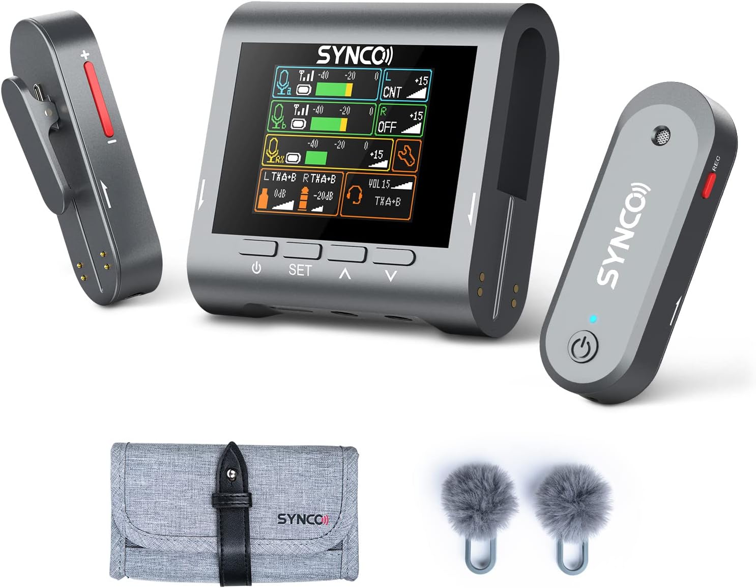 - ă1.8-inch LCD Screen for Instant AdjustmentăAdvanced setting like Sound Track Management simply operated with four buttons and the 1.8-inch LCD of SYNCO G3 wireless clip on microphone, a largest screen in microphone to display all settings, such as sound effect, gain value, power level, frequency setting in plain sight. You can command the status of microphone at a glance.