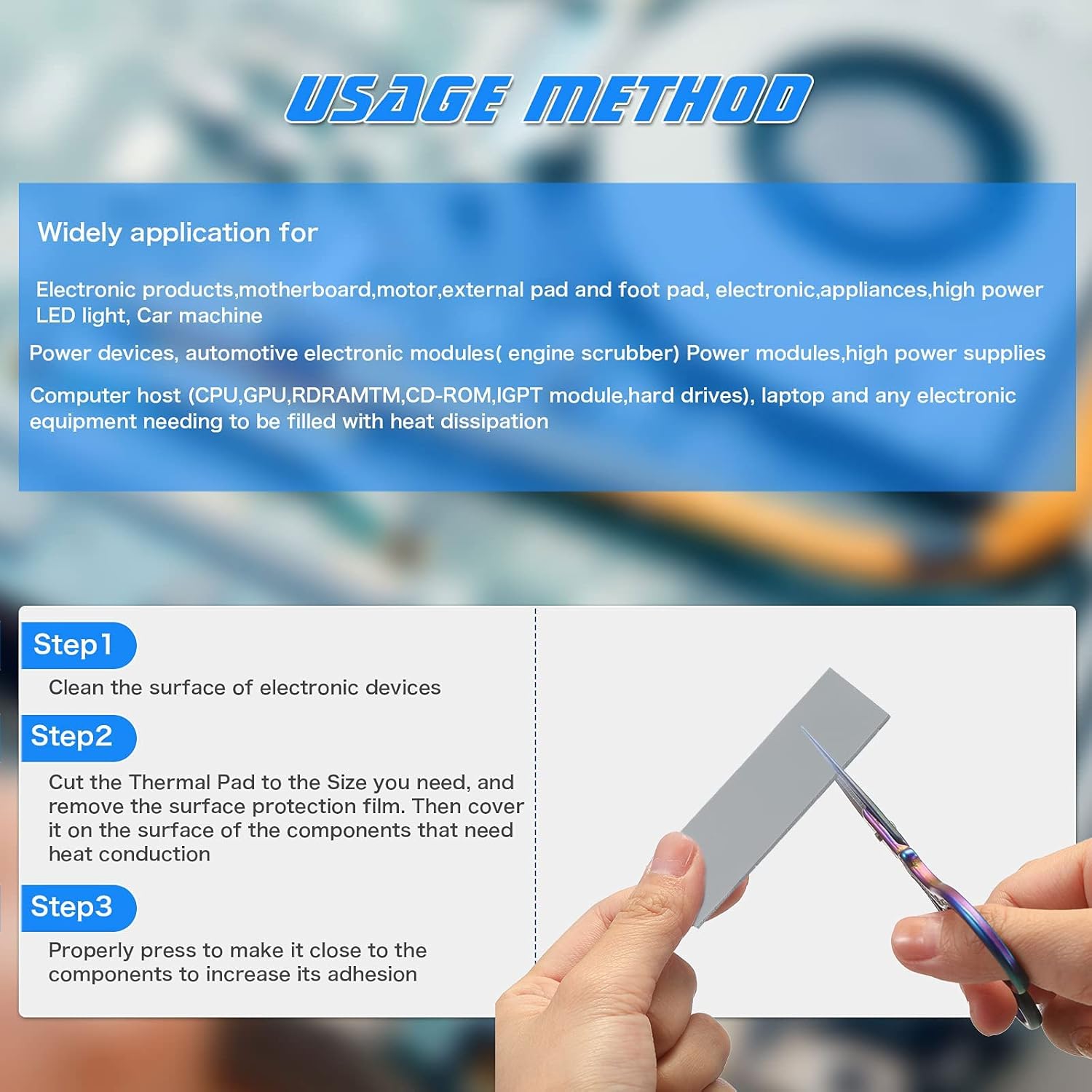 - Widely Application: nicely replaces traditional heatsink compound grease paste, suitable for control board, motor, electronics, CPU, GPU, heat sink, power LED, auto mechanics, computer host, laptop, DVD, VCD, LID, Set-top box, LED IC and any cooling modules