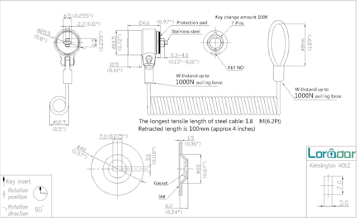 - 【Self-rolling cable】 The maximum stretching length can reach 1800mm (6ft). The minimum rebound size is 100mm (4in). Anchor plate with strong adhesive, please wipe the sticking area clean before use, static pressure for 3-5 minutes, maximum pressure of 60lb after 48 hours The cable connector can withstand the maximum 1100N tensile test. This lock is exquisite and compact, with military quality, easy to carry and save space