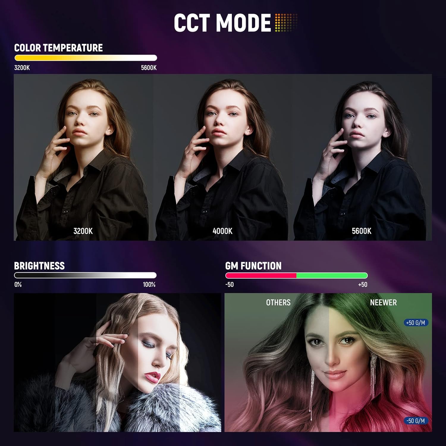 - 【Bi Color CCT Mode】 In CCT Mode, you can get 3200K~5600K variable color temperature and 0~100% dimming free of flickers for makeup, Zoom calls, or macro photography. The GM (green/magenta) function assists with color correction and enables you to get the accurate color temperature with ease. 150 SMD LEDs deliver soft, stable lighting and a high 98+ CRI for true color reproduction