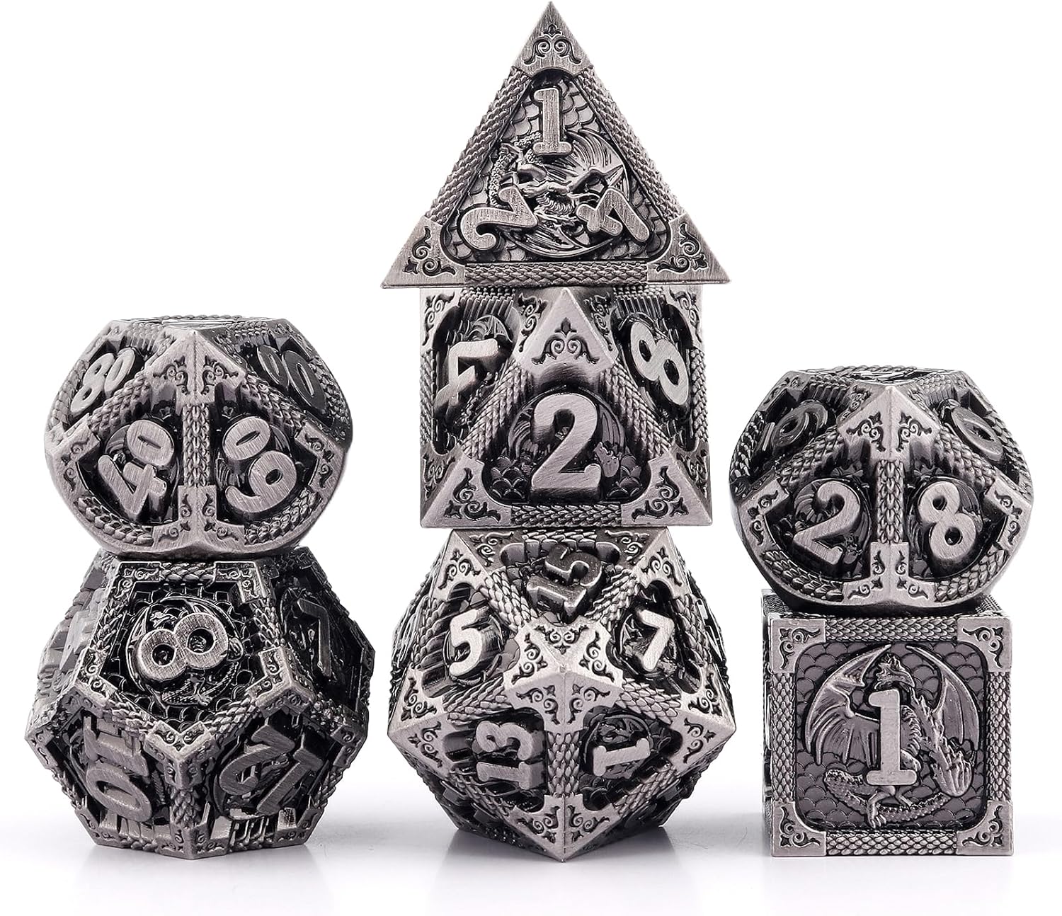 - DND Dice Metal with Box -- Including 7PCS antique silver metal dice set: 1xD% 1xD20, 1xD12, 1xD0, 1xD8, 1xD26, 1xD4, and a delicate metal case for convenient storage and display of these game dice, and is a necessary item for you to ascend the throne of victory.