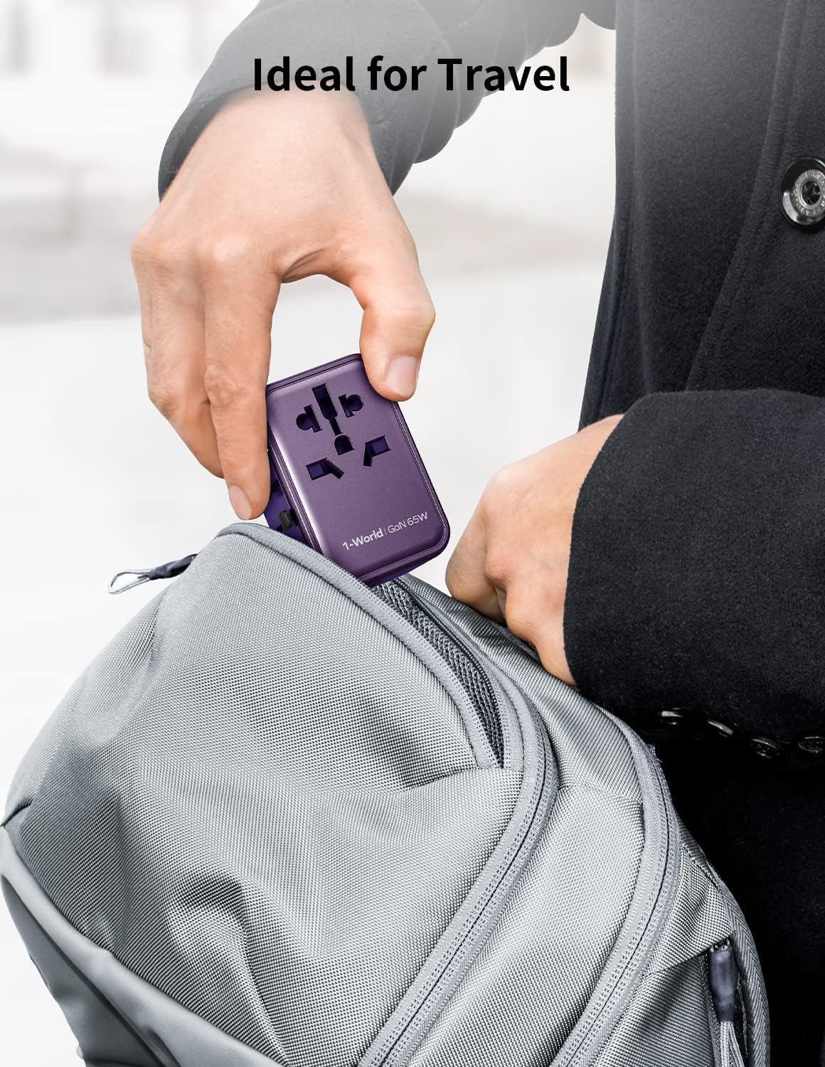 MOMAX Universal Travel Adapter, 70W GaN Travel Plug Adapter with UK,EU,AU,US Plugs, 3USB-C PD & 2USB-A QC International Adapter Charger, International Adapter for Laptops Phones Vision Pro, Purple