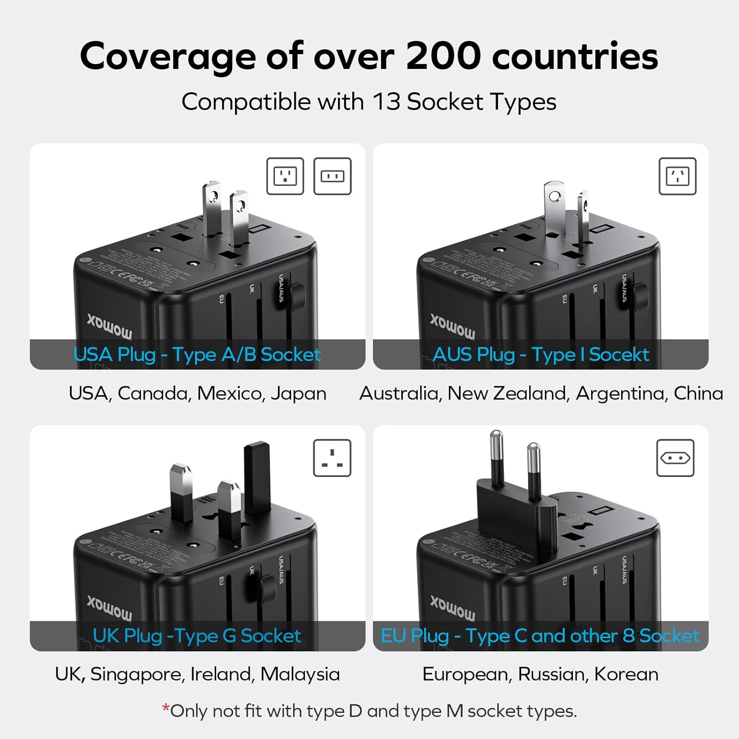 - All-IN-ONE WORLDWIDE ADAPTER - This universal power adapter features 4 plug types compatible with the 13 type sockets of 200+ countries and regions: Type-C (most common) for most of EU, like France, Germany, Italy, Spain, Iceland, Greece,etc.; Type-G for UK, Ireland, HK, Malaysia, Singapore; Type-I for Argentina, Australia, New Zealand, Fiji, China; Type-A for Japan, USA, Mexico, Canada