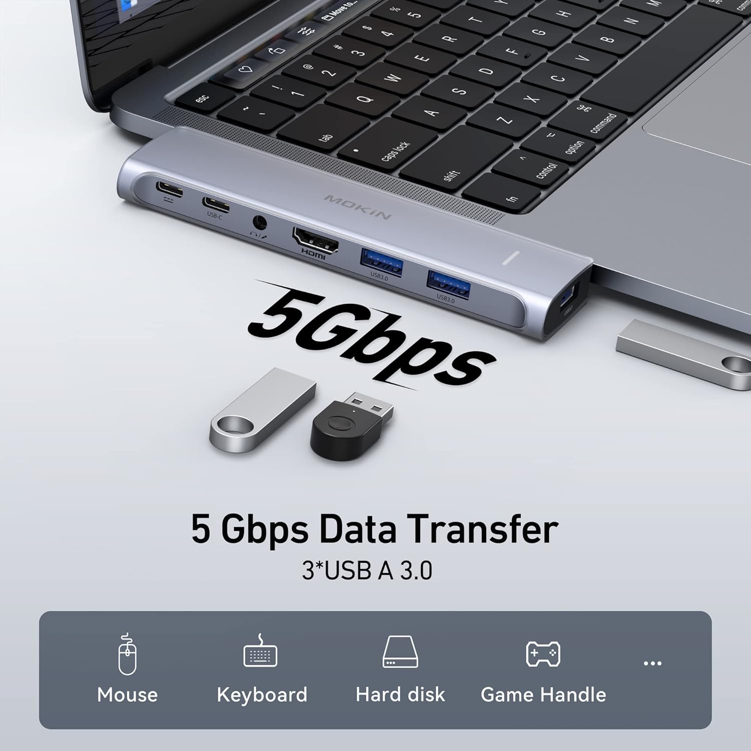 MacBook Pro Adapter, USB C Adapter for MacBook Pro/Air M1M2M3 2022 2021 2020 13" 15" 16", Mac Dongle with 4K HDMI, 3 USB 3.0, USB C 3.0 and 100W Thunderbolt 3, Audio, Support MagSafe 3 Charging
