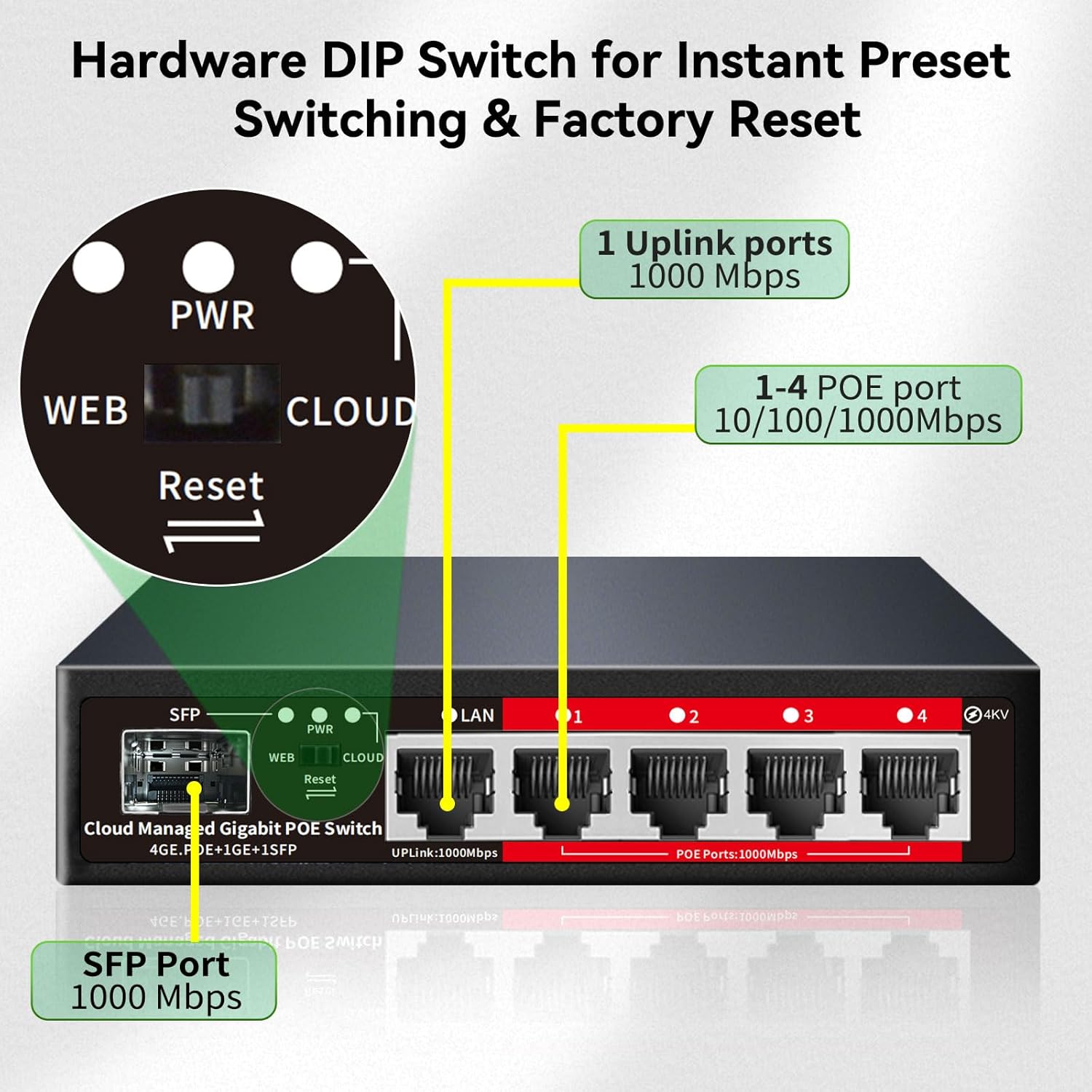 Poe Switch, 5 Port Gigabit PoE+ Switch, Cloud Managed Gigabit Ethernet Switch, 4 Poe Ports @52W, 1 Uplink Ports, 1 SFP Slot, APP Smart Managed, Overload Protection w/ Port