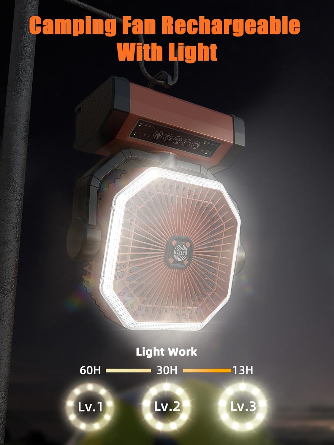 - PORTABLE CAMPING FAN WITH Light & Hook: This camping fan battery powered offers 12 LED beads, 3 dimmable brightness functions for different occasions. Great portable fan for bedroom, Office, Camping, RV, Power Outage, Rtc. The 2-in-1 portable outdoor fan has a 360° rotating hidden hook so you can hang the fan up and adjust the right angle. In addition, it is also suitable for use indoors as a large battery operated fan. This would be a great gift for your family and friends.
