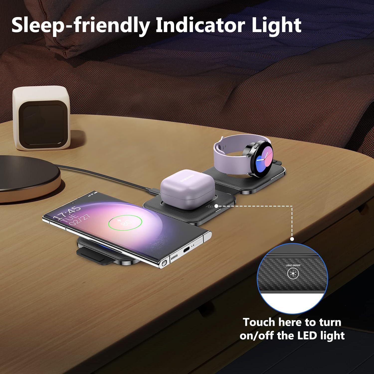 - SLEEP & USER-FRIENDLY CHARGER:Design with a turn ON/OFF function. Easy to turn off the LED light with the touch button (next to the earbuds charging area). 3 In 1 design solving the problem of messy charger cables on your desk. The foldable and adjustable design makes your business trip and vacation convenient and happier.