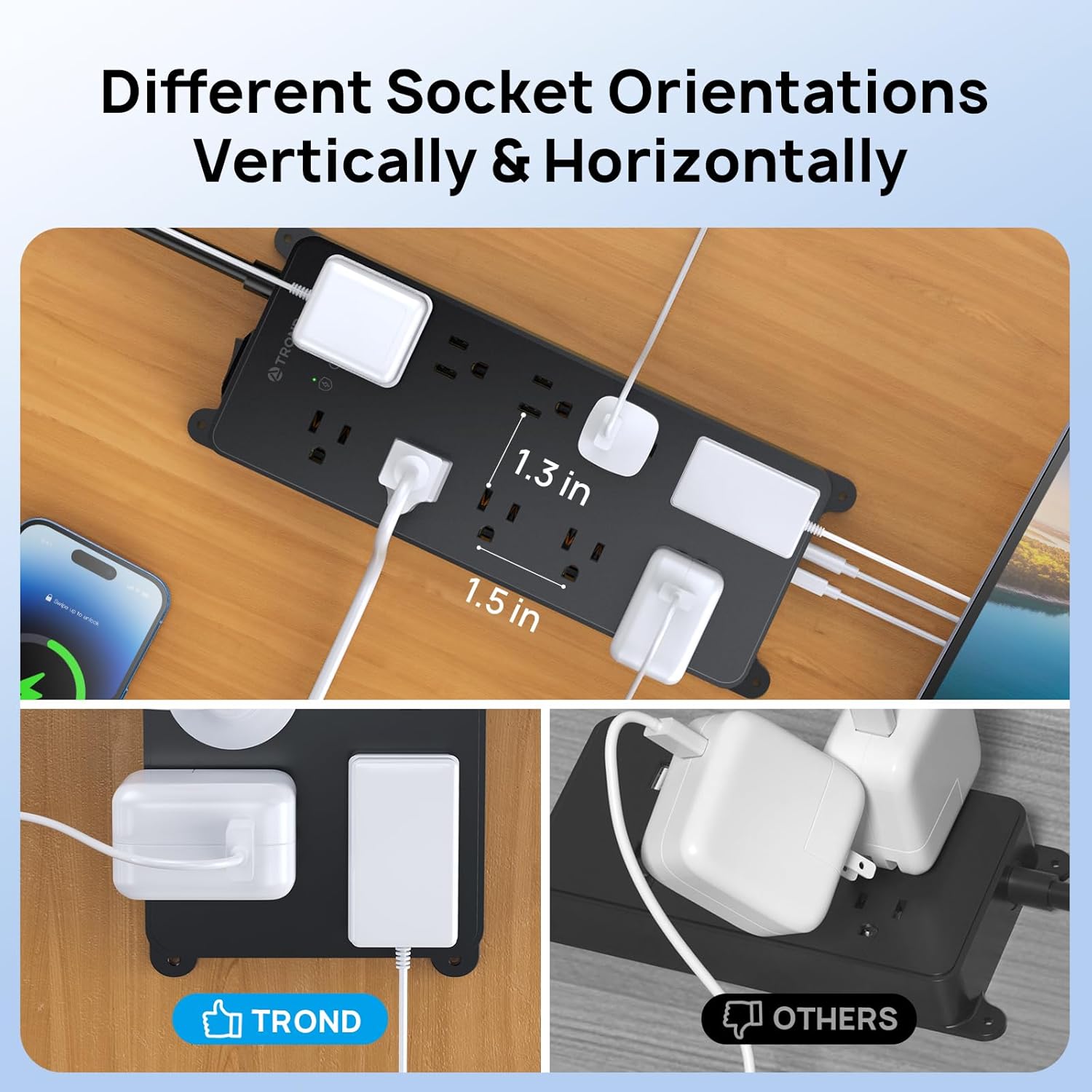 - 10 Widely Spaced AC Outlets: This surge protector power strip features 10 widely spaced outlets that come in two different directions - horizontal & vertical, enlarged distance between 10 outlets can plug large power adapters without blocking other outlets