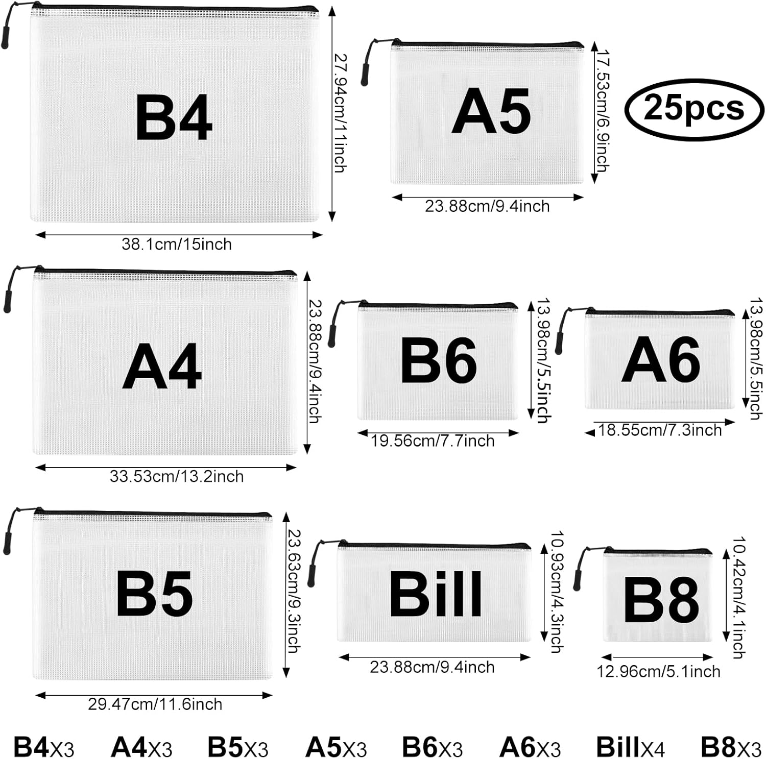 - What You Will Get: 25pcs zipper organizer bags. 3*B4 (14.9*11 inches), 3*A4 (13.1*9.4 inches), 3*B5 (11.6*8.2 inches), 3*A5 (9.4*6.8 inches), 3*B6 (7.6*5.5 inches), 3*A6 (7.2*4.5 inches), 4*Bills (9*4.3 inches), 3*B8 (5.1*4.5 inches),come with small colored stickers to mark the contents and help you easily keep track of the items inside.