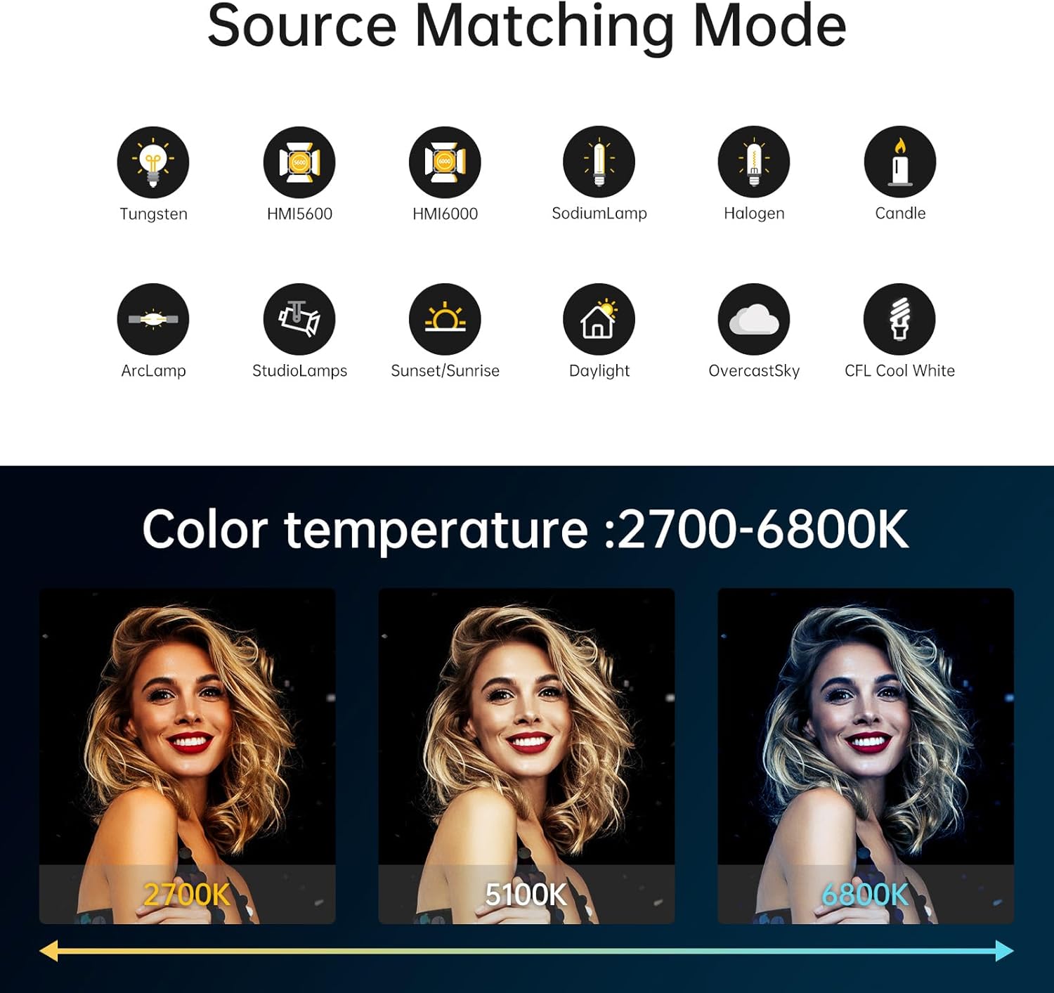 - ă12 Pre-programmed Lighting Effectsă: GVM PRO200B has 12 lighting effect modes, such as Lightning, CCT Cycle, Candle, Broken Bulb, TV, Paparazzi, Explosion, Breathing Light, Strobe, Flame, Fireworks, Welding. 12 types of Light source matching modes, which can save a lot of adjustment time when you need a specific light source.