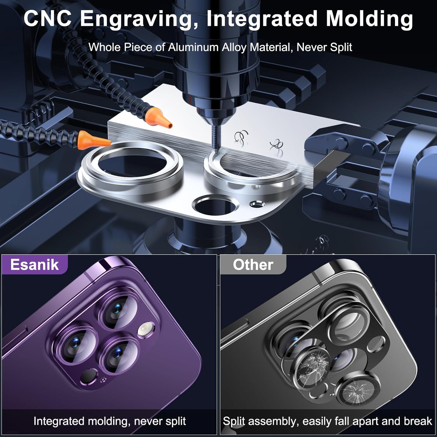 - 【CNC Engraving & Integrated Molding】 Esanik 2023 Upgrade Version iPhone 14 pro max / iPhone 14 Pro Cam Cover is precisely carved from whole piece of high-quality aluminum alloy, firm and long lasting. Bid farewell to the split and falling apart issues resulting from the conventional split assembly process.
