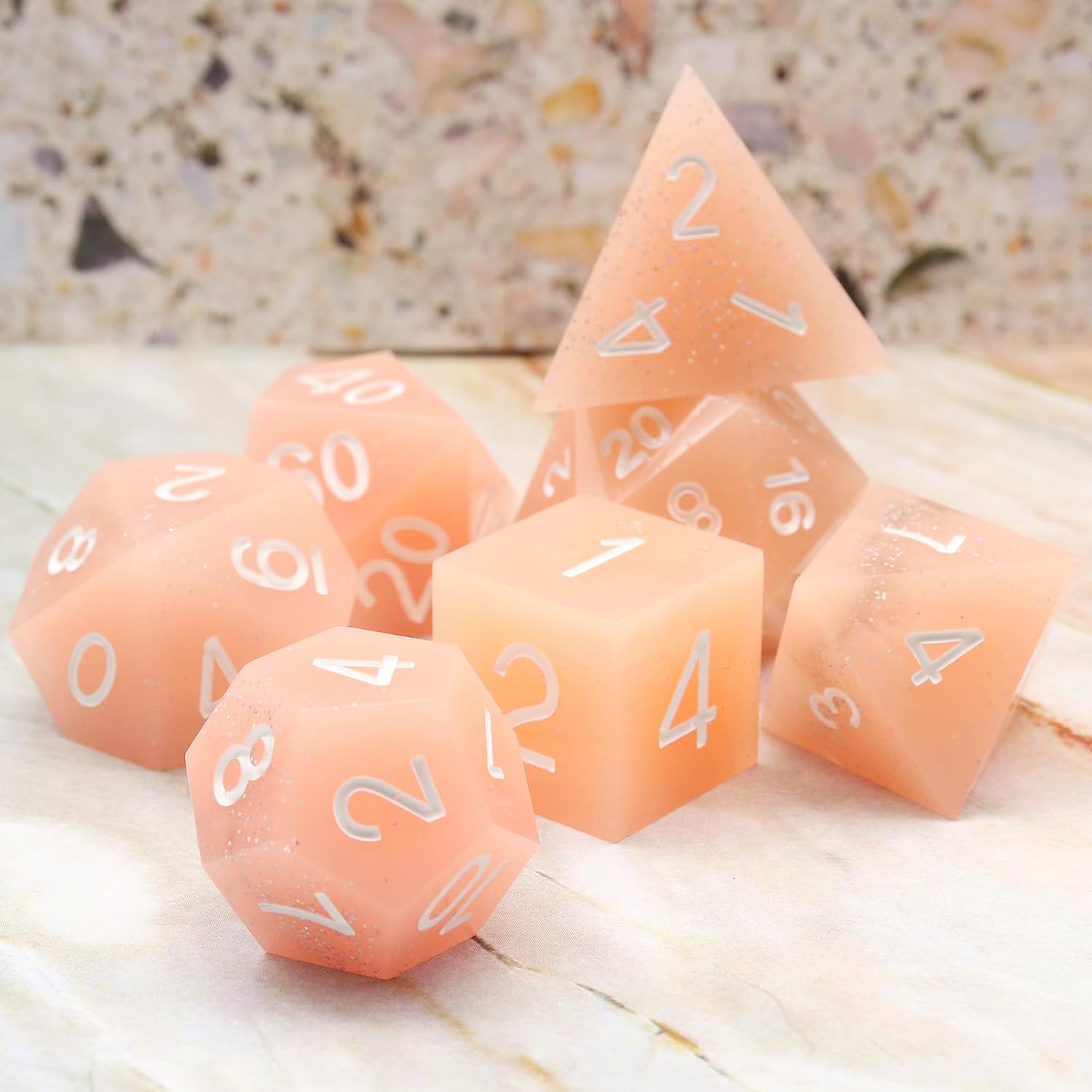- Pink Sharp Edge Dice: Pretty cute sharp edge dnd dice set with silver glitters. Neat and clean mirror-level surface 7PCS rpg dice set containing one of each of d4, d6, d8, d10, d%, d12 and d20.