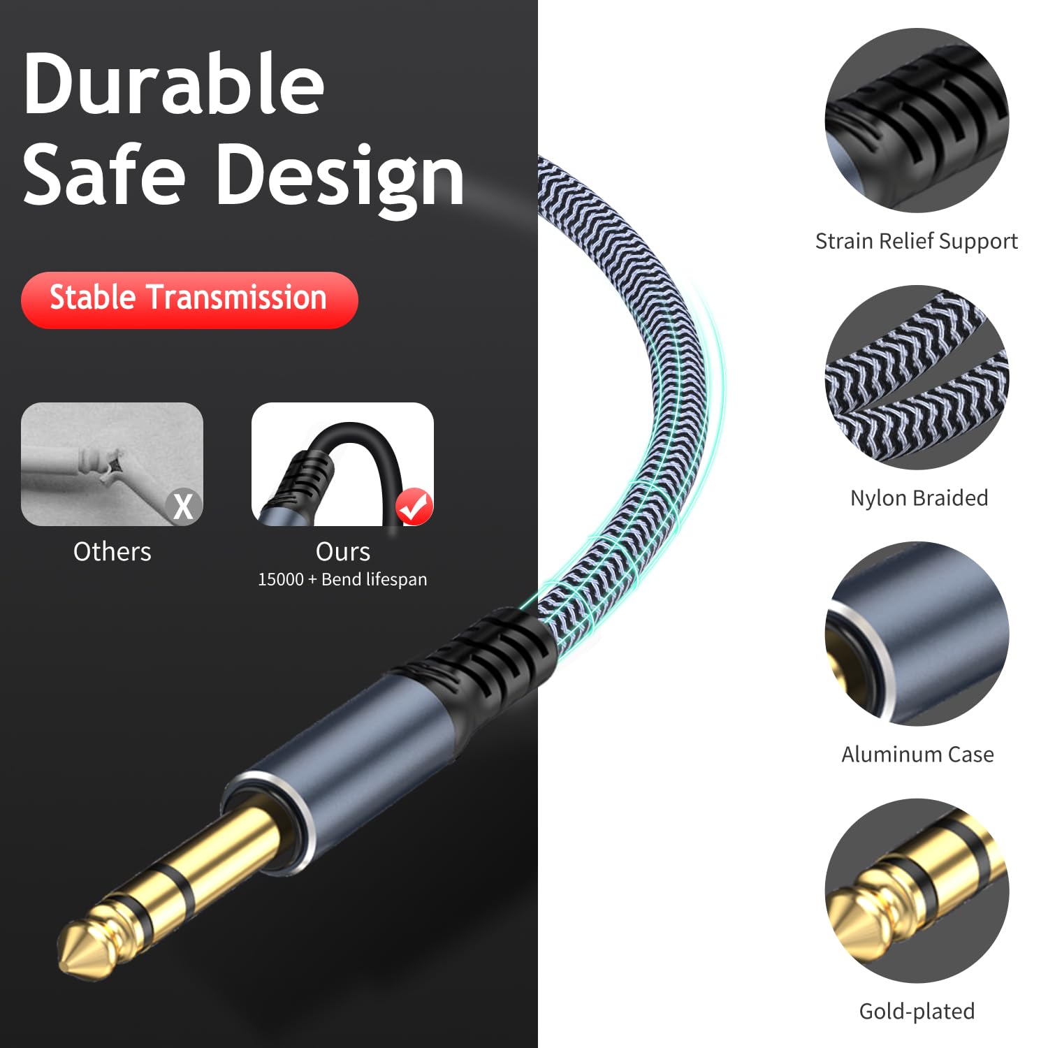 - ā« TAiSUSAN 6.35mm extension cable uses high quality tinned copper wire and gold plated connectors, transmit high quality sound, strong and sturdy. We adopt injection Molding and shielded manufacuting process to improve its durability and stability, prevent EMI/RFI interference.