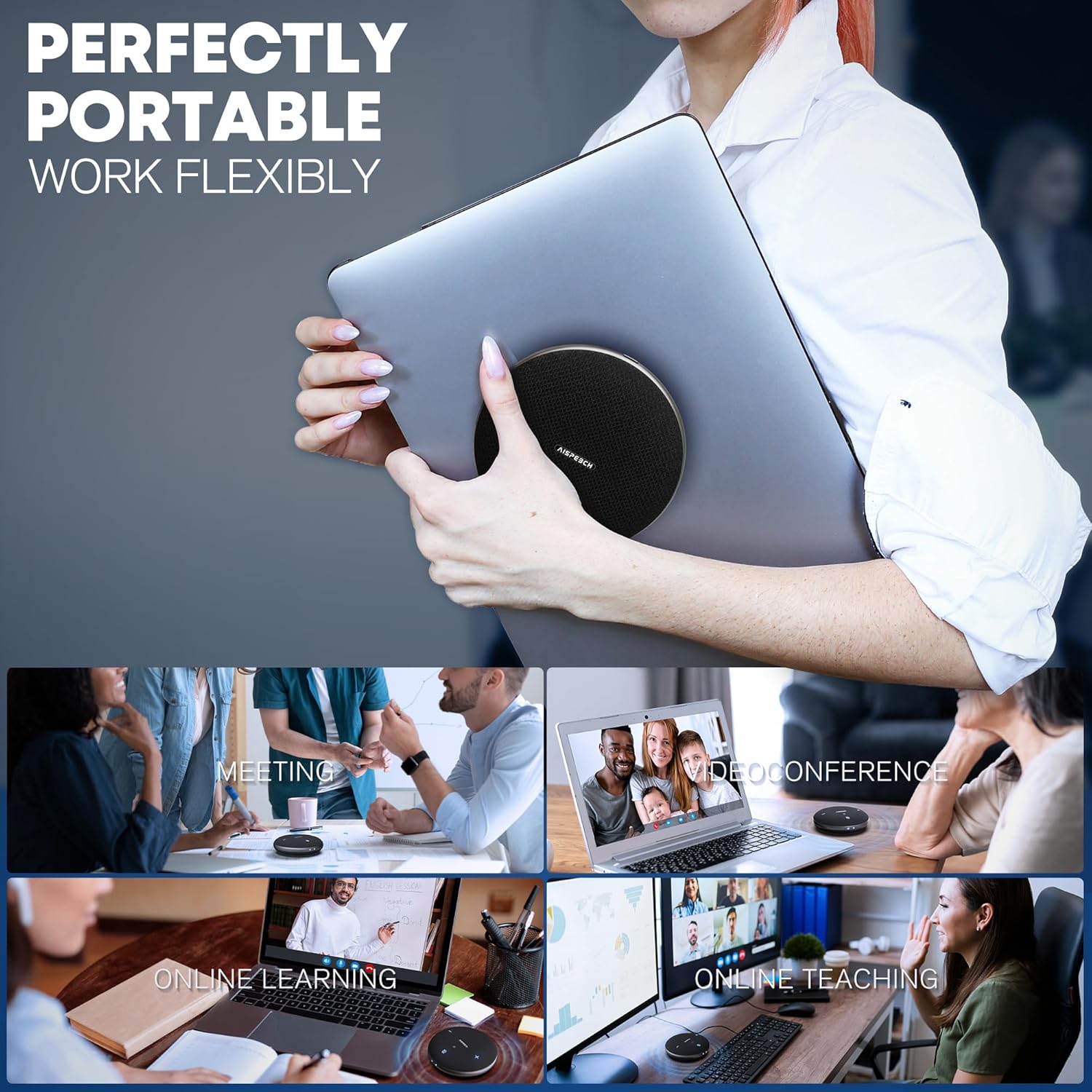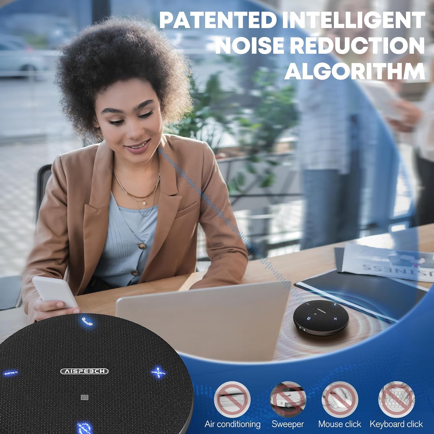 - 【AI-Powered Noise Reduction】Say goodbye to noisy conference calls with our M4 speakerphone! This M4 bluetooth speakerphone is equipped with advanced AI technology that has been trained on thousands of hours of real-world conference call data. By intelligently differentiating between human voices and ambient noises, common background noises in the workplace, such as mouse or keyboard clicks, loud conversations and other noise, can be effectively reduced. Ideal for office or home working.