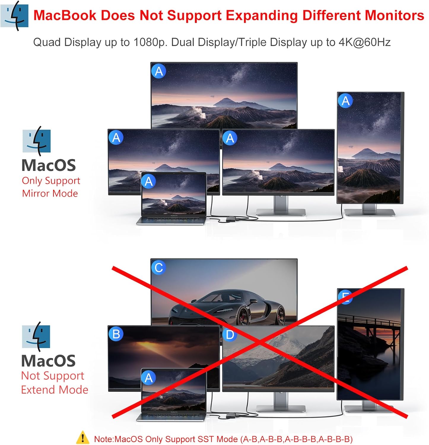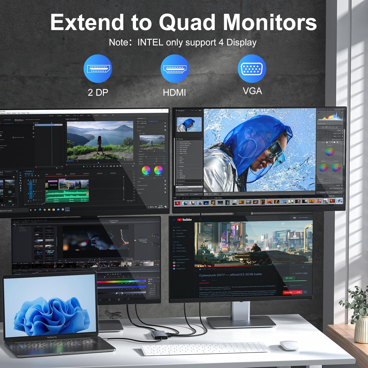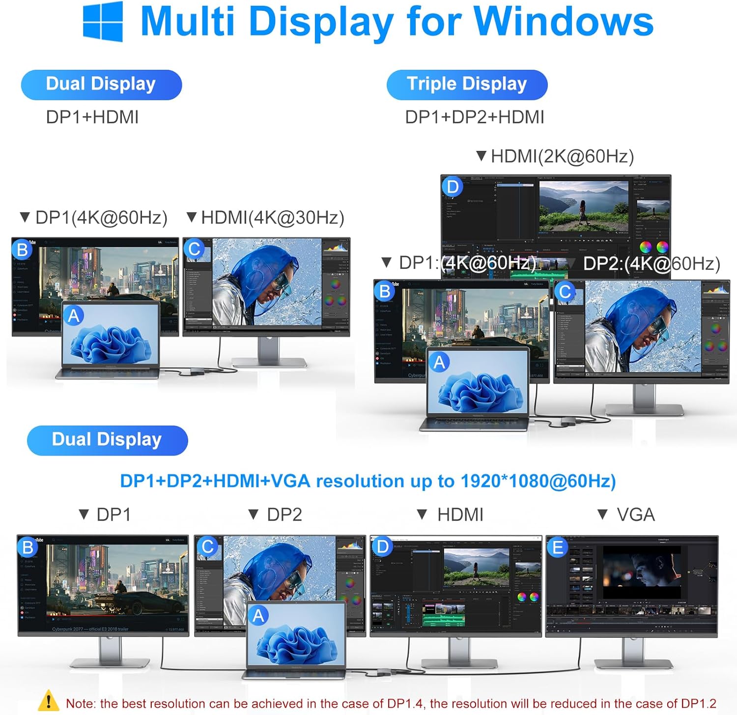 - Dual and Triple 4K Display Multiple Adapter: This docking station dual monitor can easily achieve dual monitors,triple displays and quad monitors for Windows laptop.While single use HDMI/DP1/2resolution up to γ4K@60Hz, single use VGA resolution up to 1080@60Hz. When using DP1/2+HDMI, dual monitors will be 4K@60Hz and 4K@30Hz(DP1.4); When using HDMI+DP1+DP2, triple monitors will be 2*4K@60Hz+2K@60Hz (DP1.4); Display output will be 1080P when quadruple displays and multiple monitors with VGA
