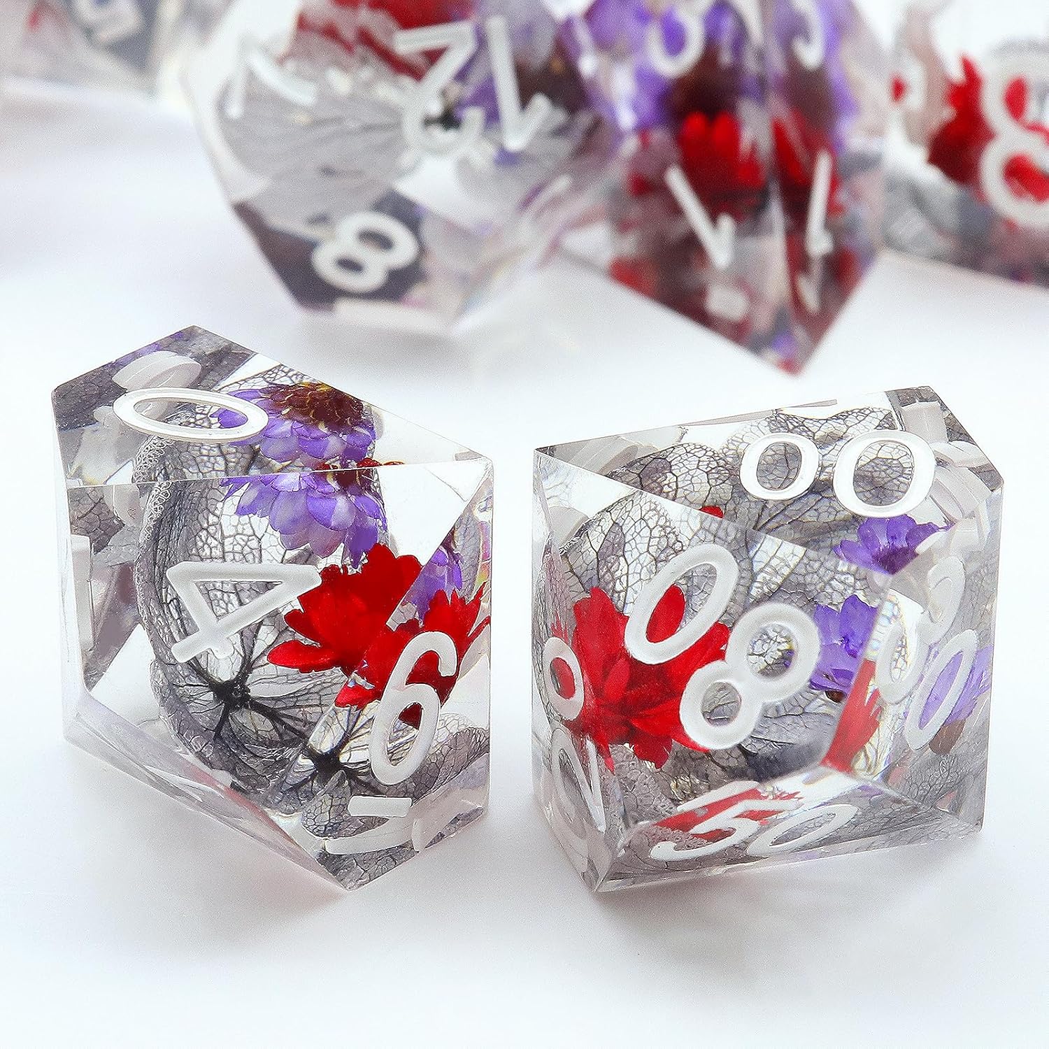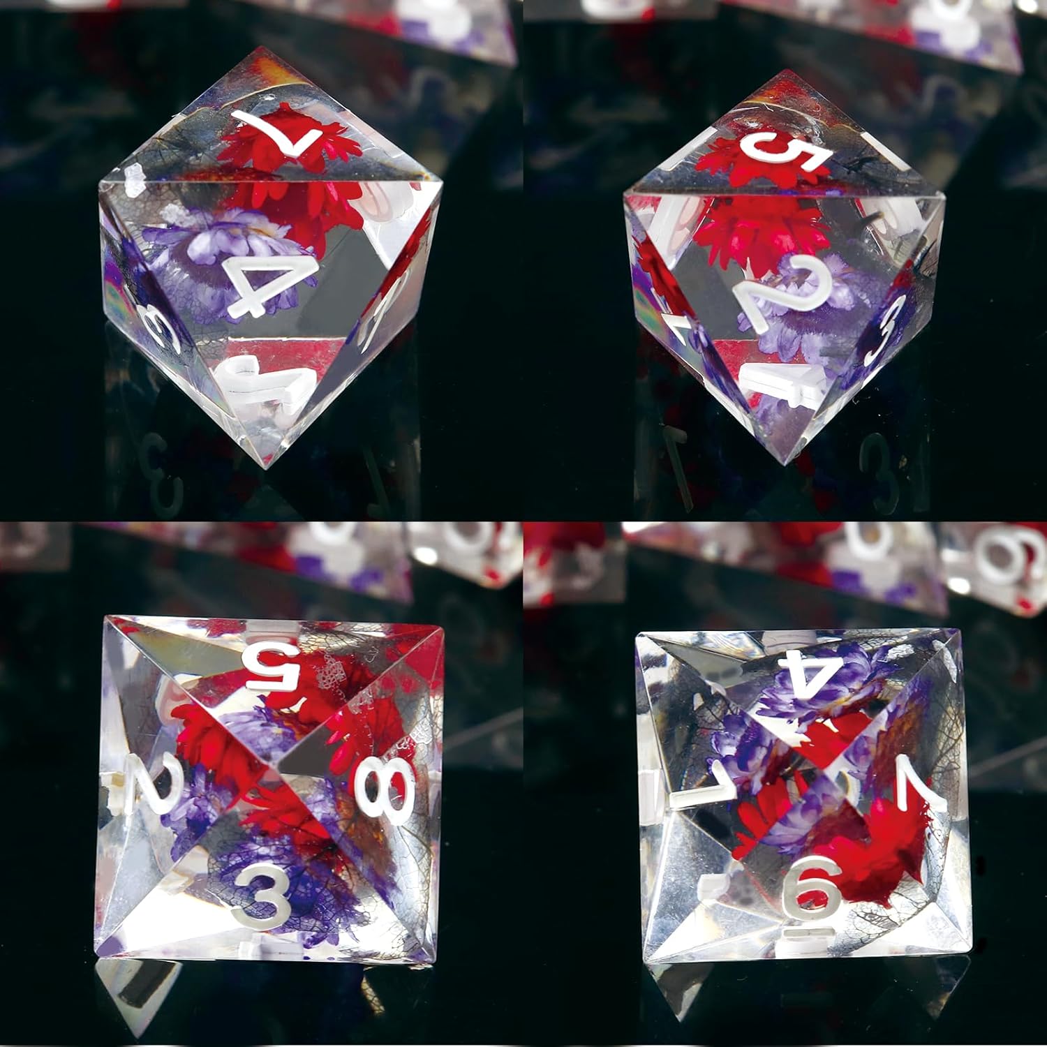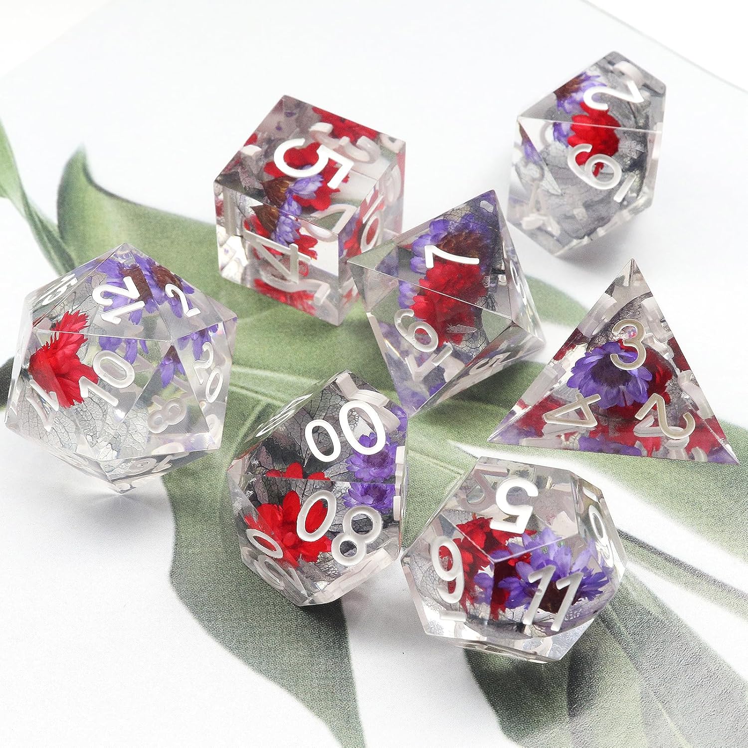 - Flower Sharp Edge Dice With Dice Box: Pretty floral sharp edge dnd dice set with dual color real flowers inside. Neat and clean mirror-level surface 7PCS rpg dice set containing one of each of d4, d6, d8, d10, d%, d12 and d20.