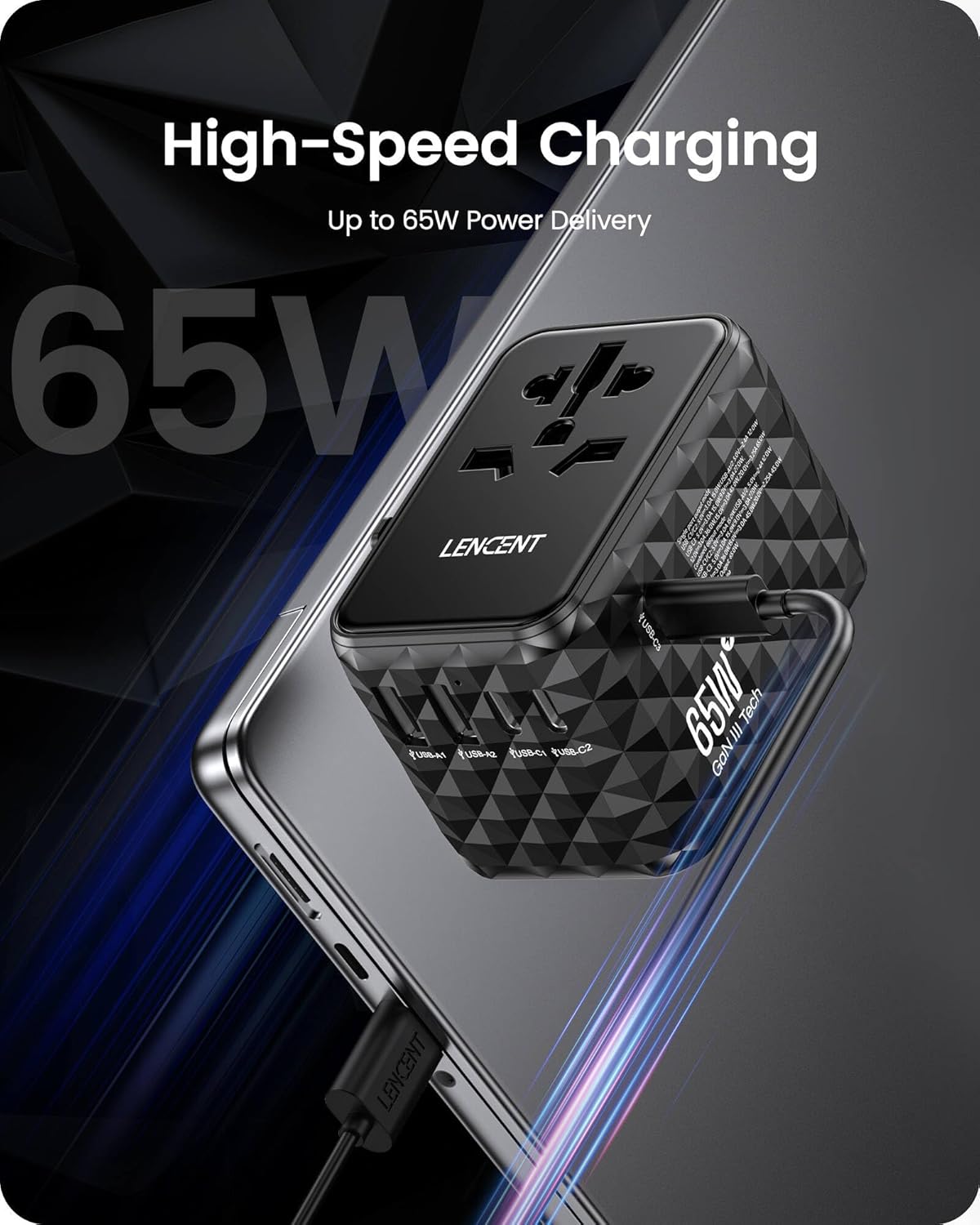 LENCENT 65W GaN International Travel Adapter with 2 USB-A & 3 Type C Ports, Fast Charger for Phones & Laptops, Worldwide Plug Adapter for USA/UK/EU/AUS, Black