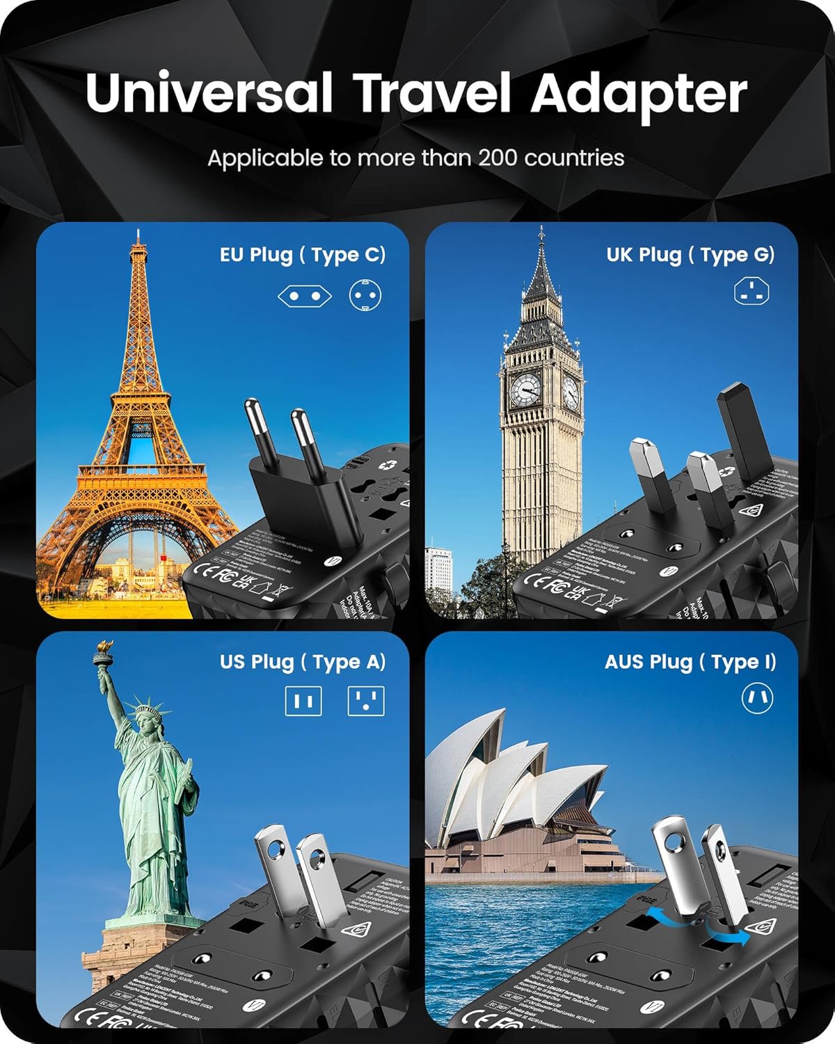 - International Travel Adapter: This travel adapter covers over 200 countries: Type C Plug: Most of Europe, France, Germany, Italy, Spain, Iceland, Greece, Israel; Type G Plug: UK, Ireland, London, England, Scotland, Dubai; Type I Plug: China, Australia, New Zealand; Type A Plug: USA, Japan, Canada