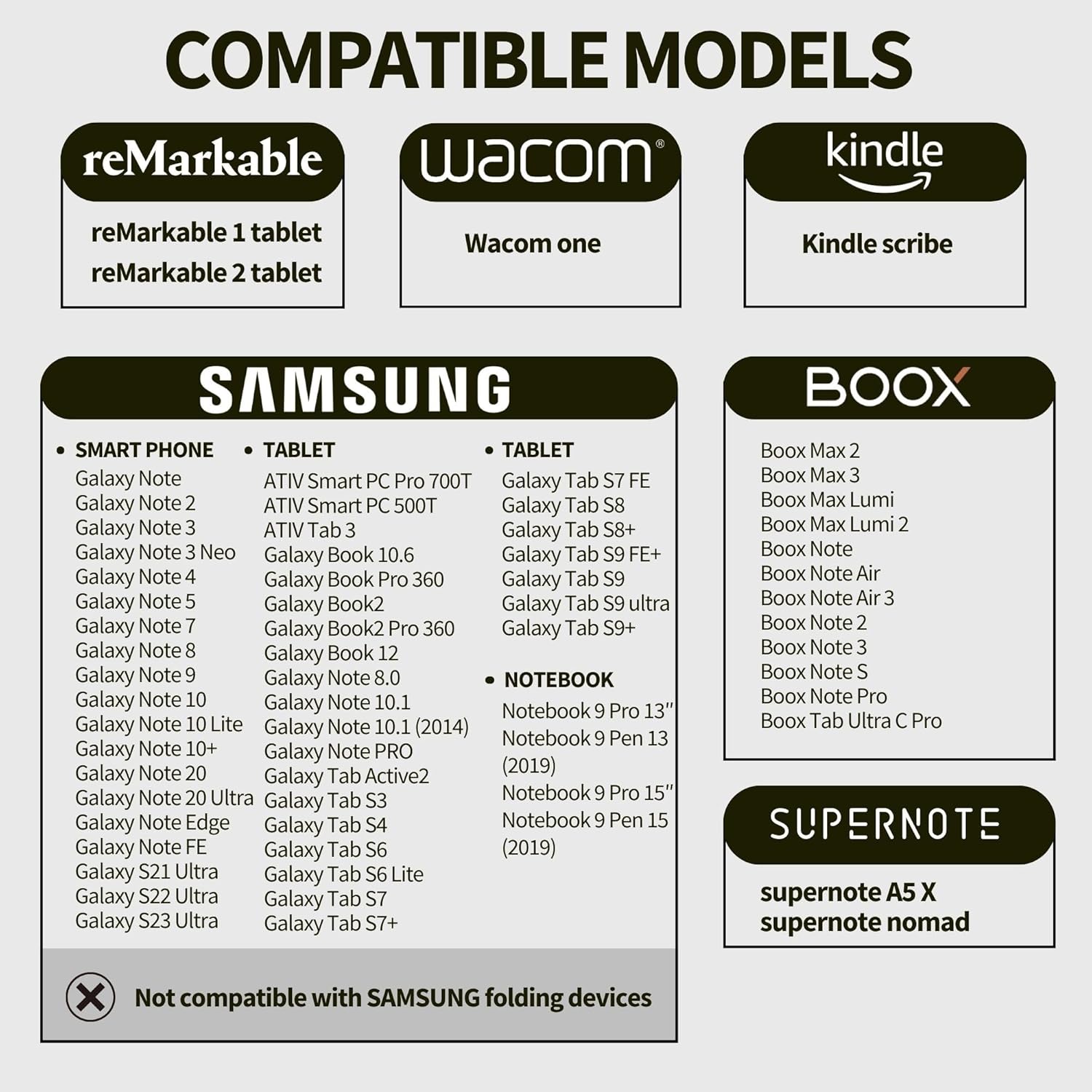 - Compatible Devices : Galaxy Tab S6/S7/S8/S9, Kindle scribe, SuperNote, reMarkable tablet 1, reMarkable tablet 2